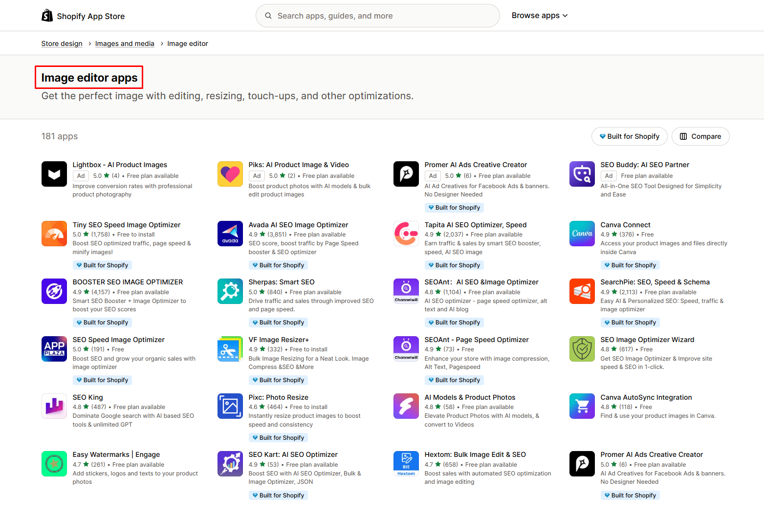 From the Shopify App Store, you can find various tools with different features for editing images.