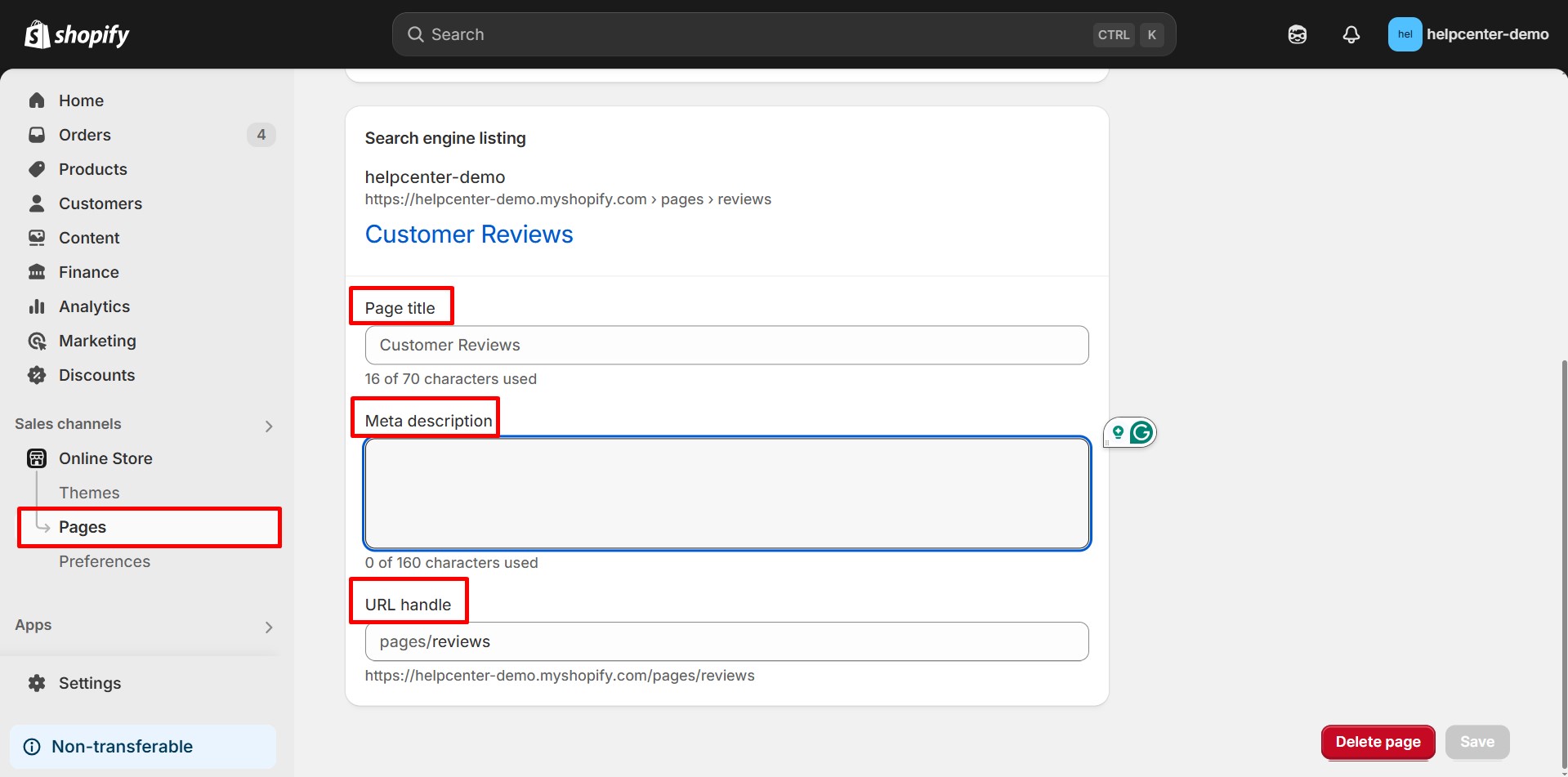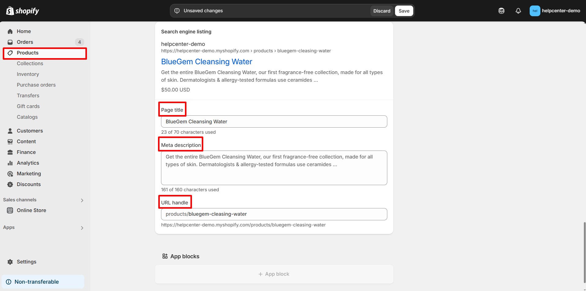 Next, input your Page title and Meta description for your product page in the fields. Click “Save” when finished.