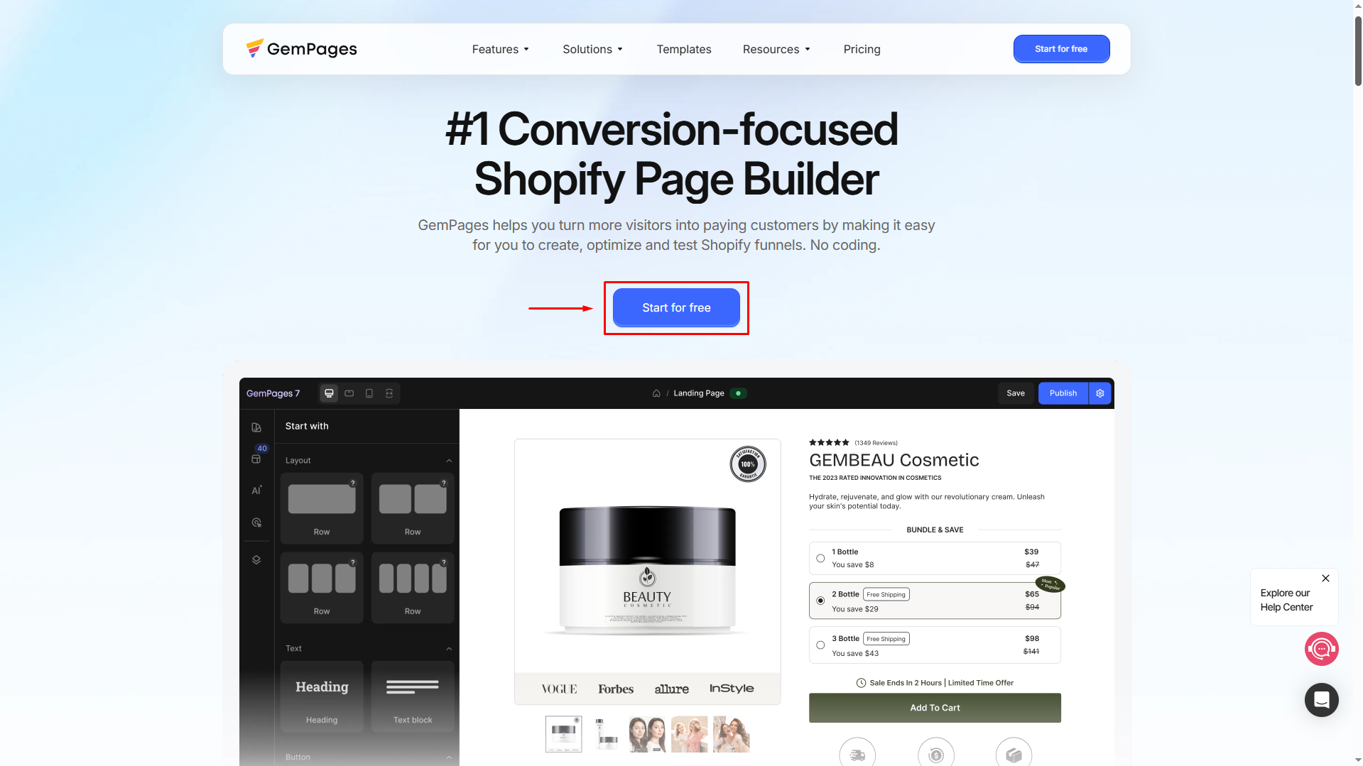 Step 1: Visit the GemPages main website. On the homepage, click on the Start For Free button. This will redirect you to the Shopify app store.