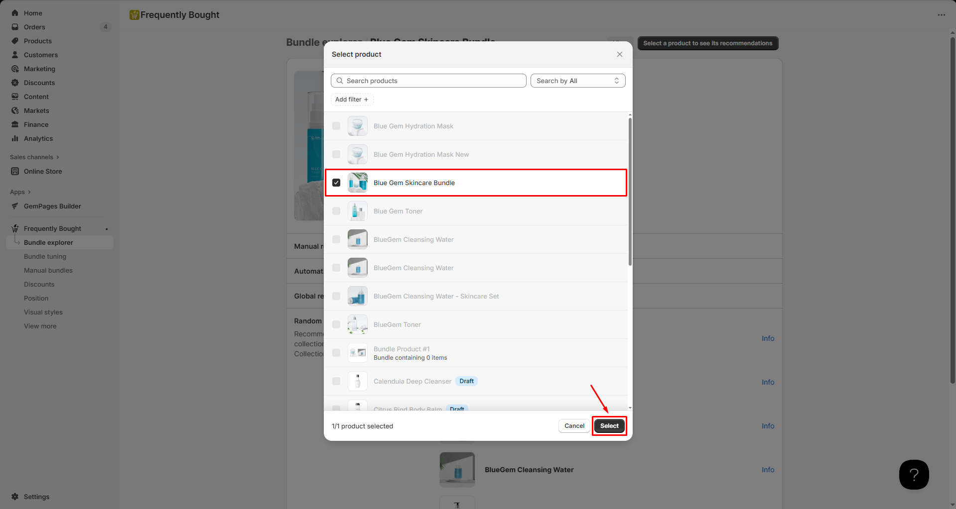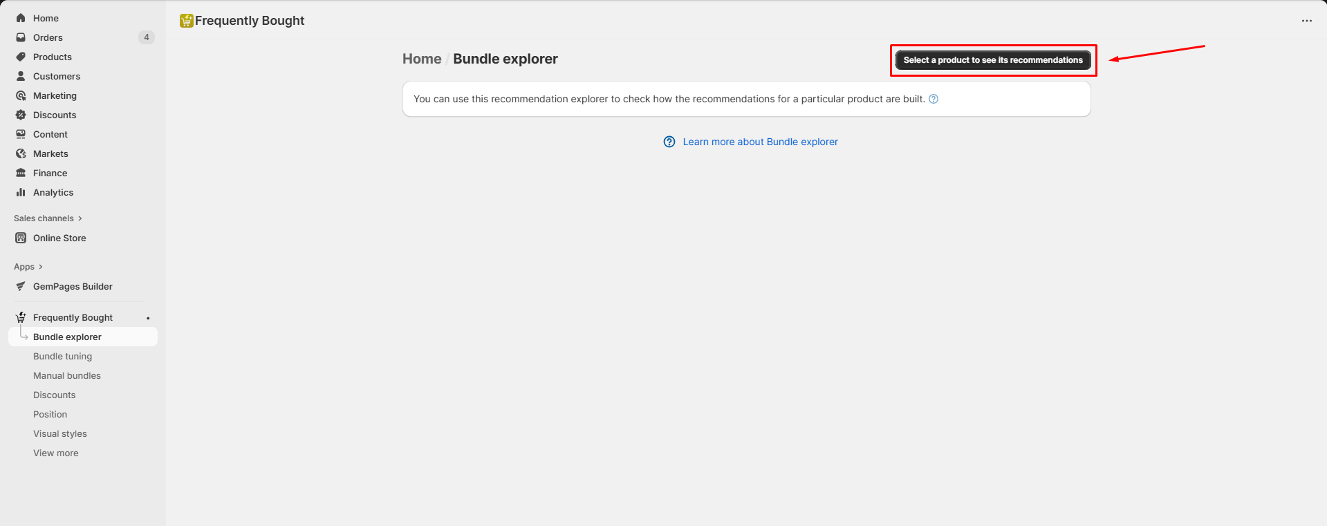 Step 1: After enabling this app, go back to the Frequently Bought dashboard > Bundle explorer > hit Select a product to see its recommendations.