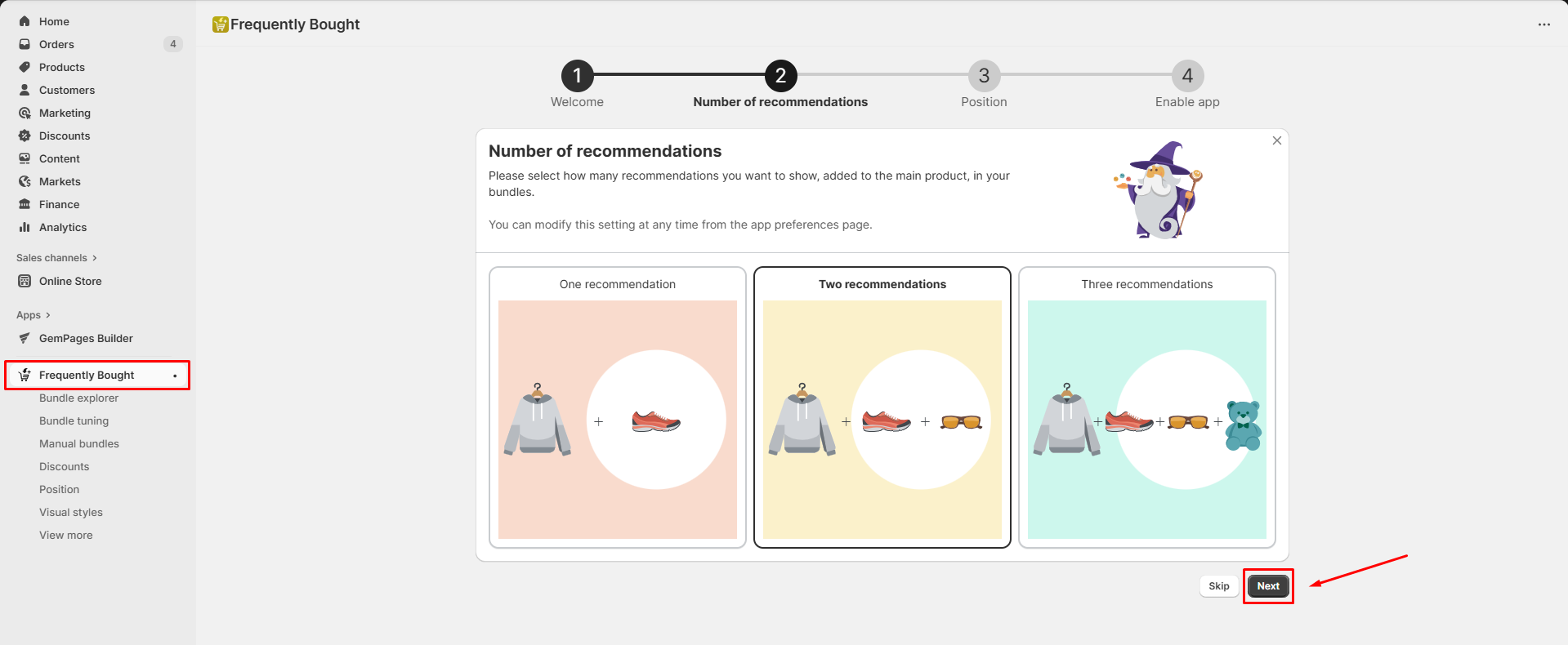 Step 3: You’ll be redirected to the Frequently Bought dashboard. Follow the onboarding instructions to select the Number of recommendations and click the Next button.
