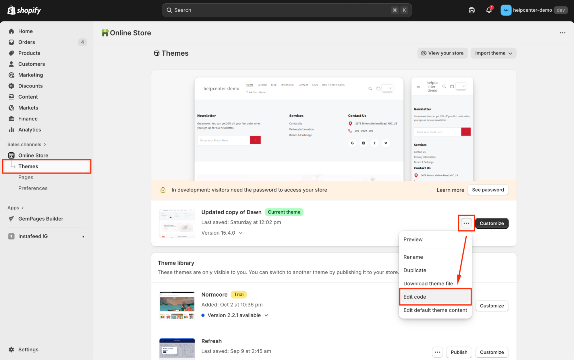 Step 3: In your Shopify Admin, navigate to Online Store > Themes, click on the three-dot icon, and select Edit Code from the dropdown.