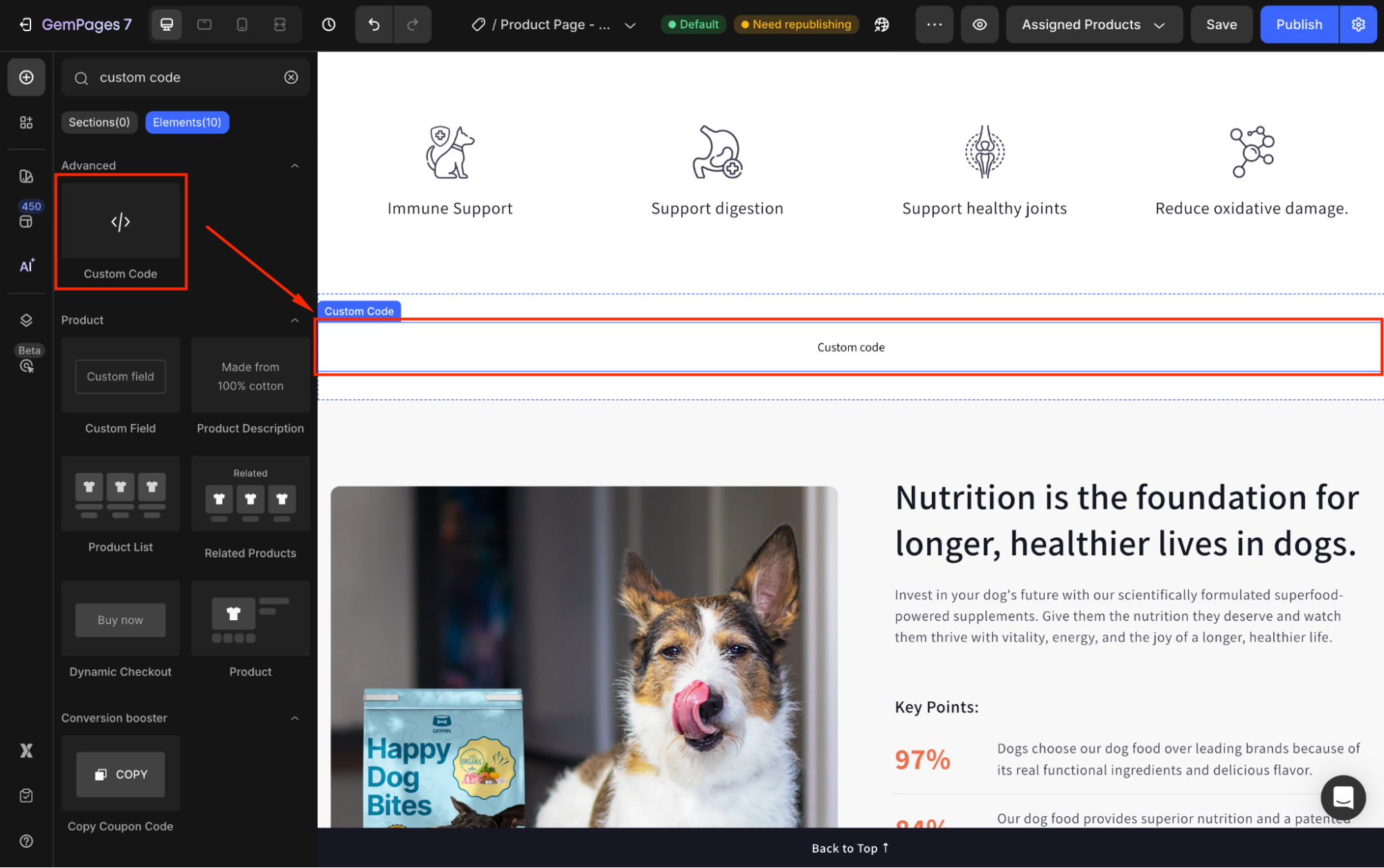 Step 2: In the GemPages Editor, use the search bar the locate the Custom Code element. Then, drag and drop the element onto your page.