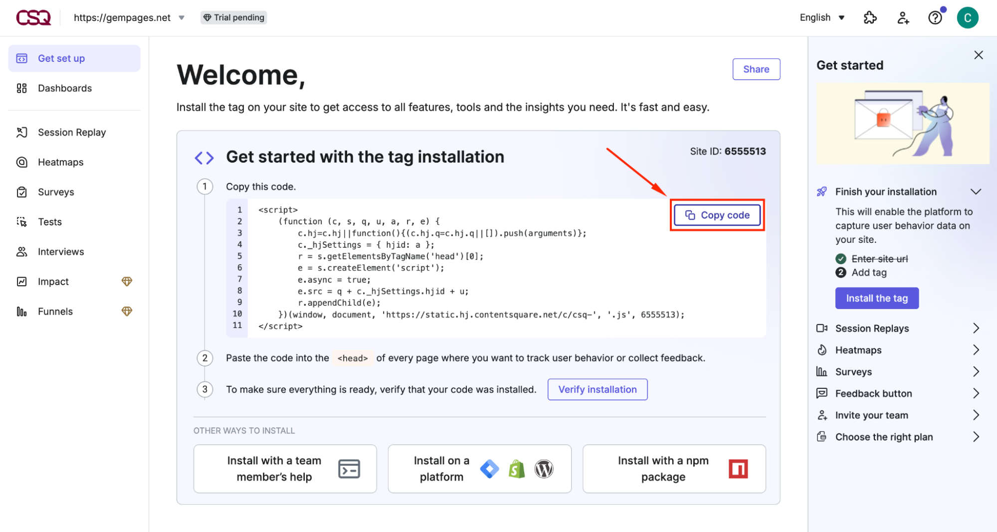 Step 2: From the left sidebar, go to Get set up, then click Copy code.