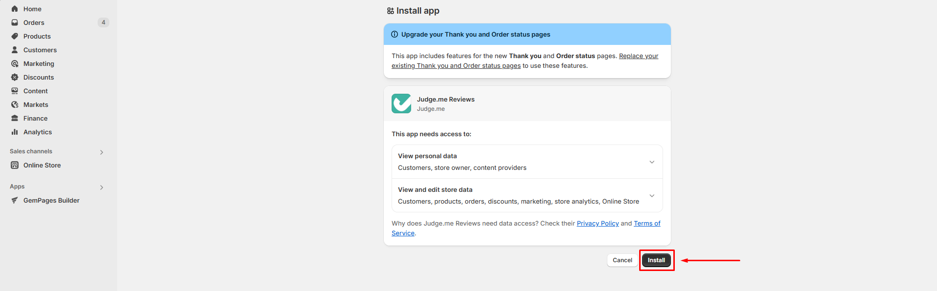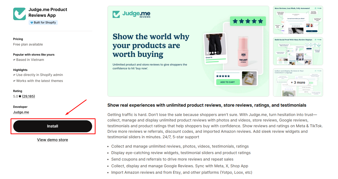 Step 1: Install the Judge.me Product Reviews app from the Shopify App Store by clicking on the “Add app” button and filling in your store domain if needed.