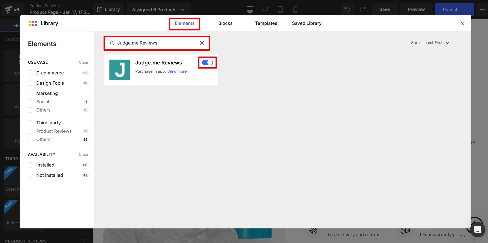 - Version check: In the GemPages v7, the Judge.me element is available by default under the Shopify Apps section on the left sidebar. While in v6, you need to enable the element first from Dashboard > Library > Elements > Third Party, then search for Judge.me Reviews.