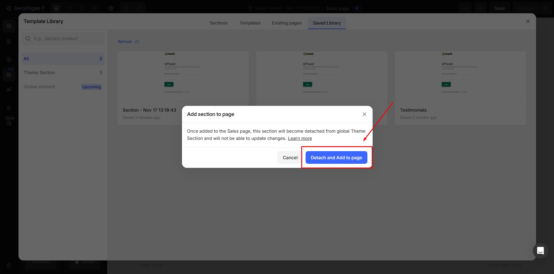 - If the user chooses Add theme section to sales page, they confirm by clicking Detach and add to page.