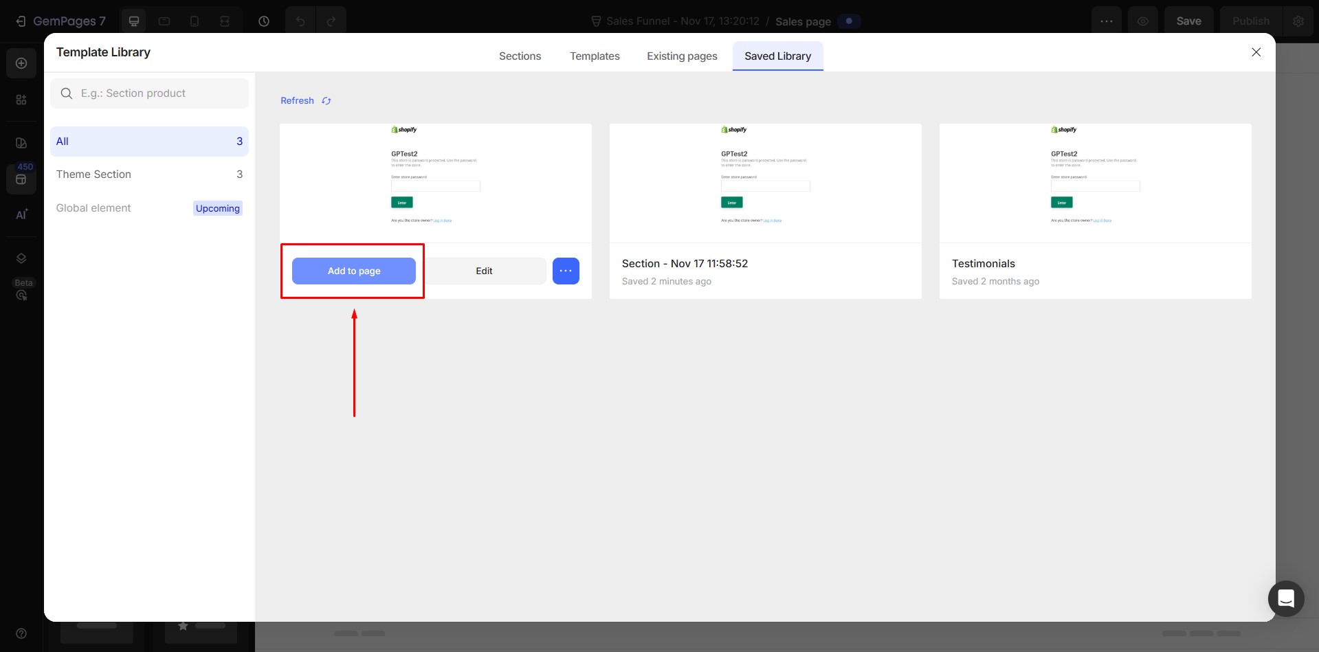 Case 1: If you add a Theme Section directly to a Sales Page