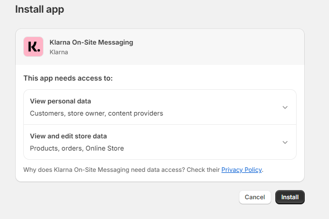 Step 1: Access the Shopify App Store, find the Klarna On‑Site Messaging app in the search bar, and click “Install.”