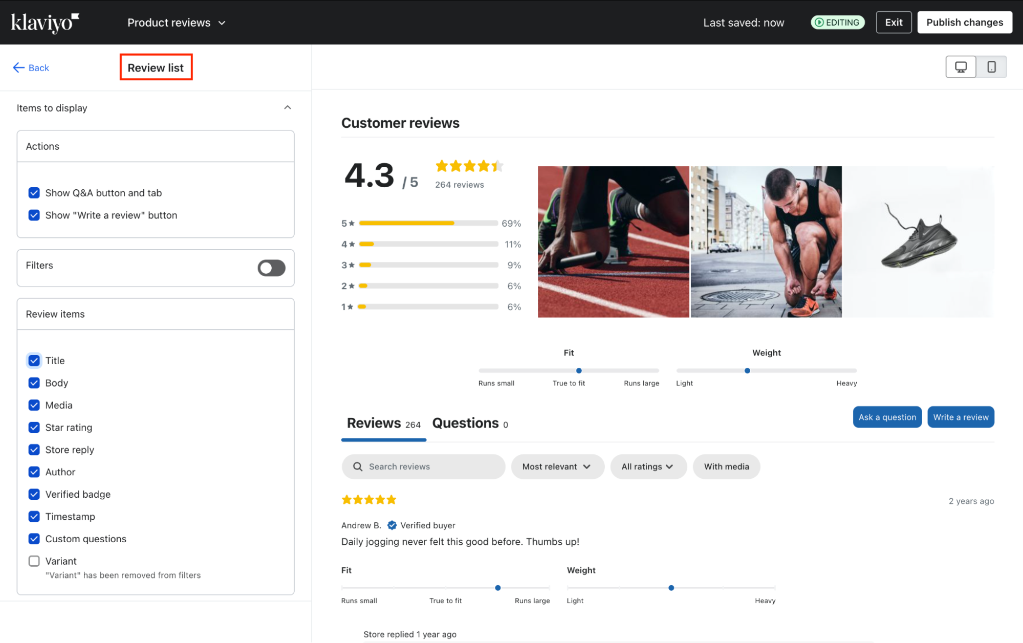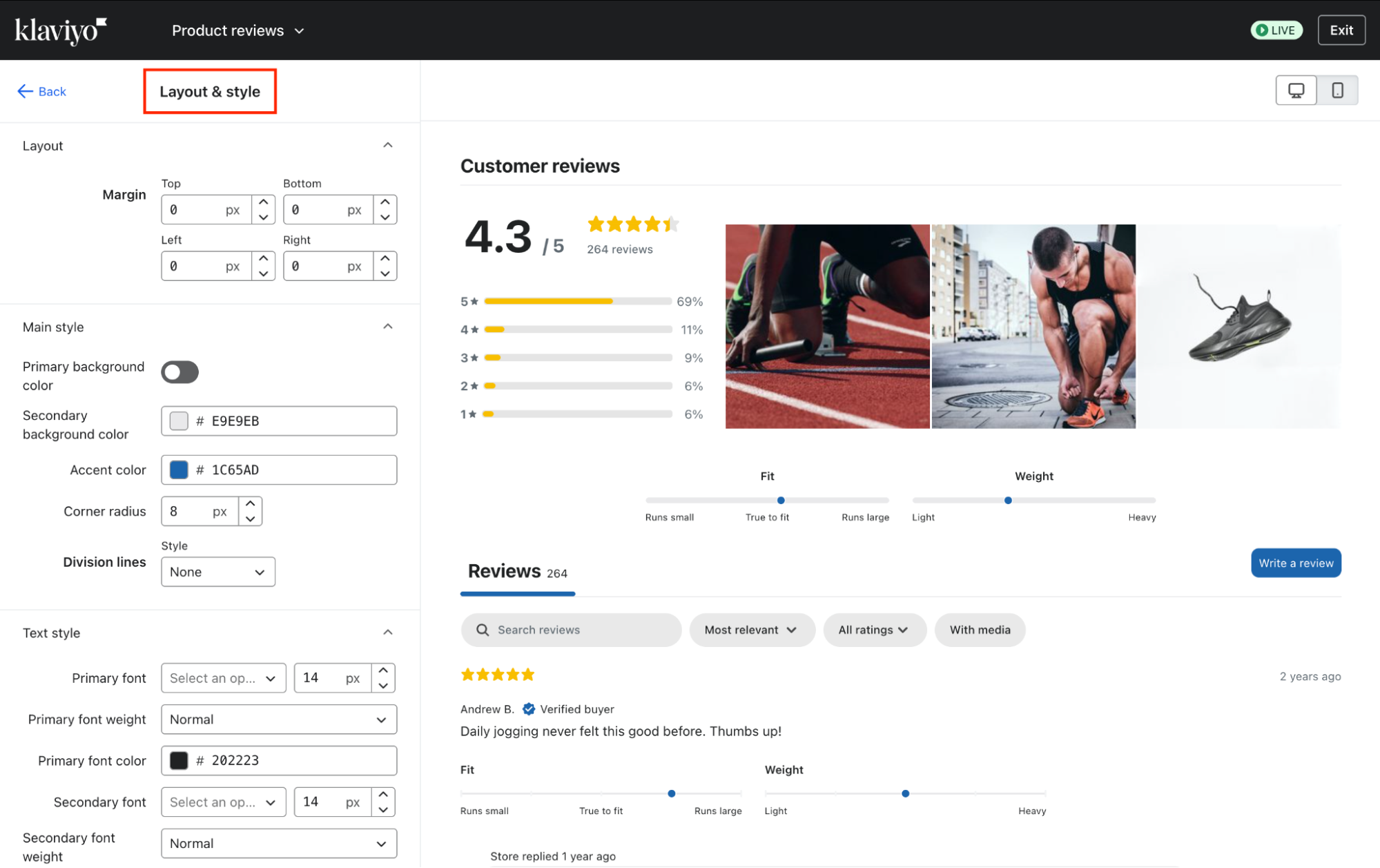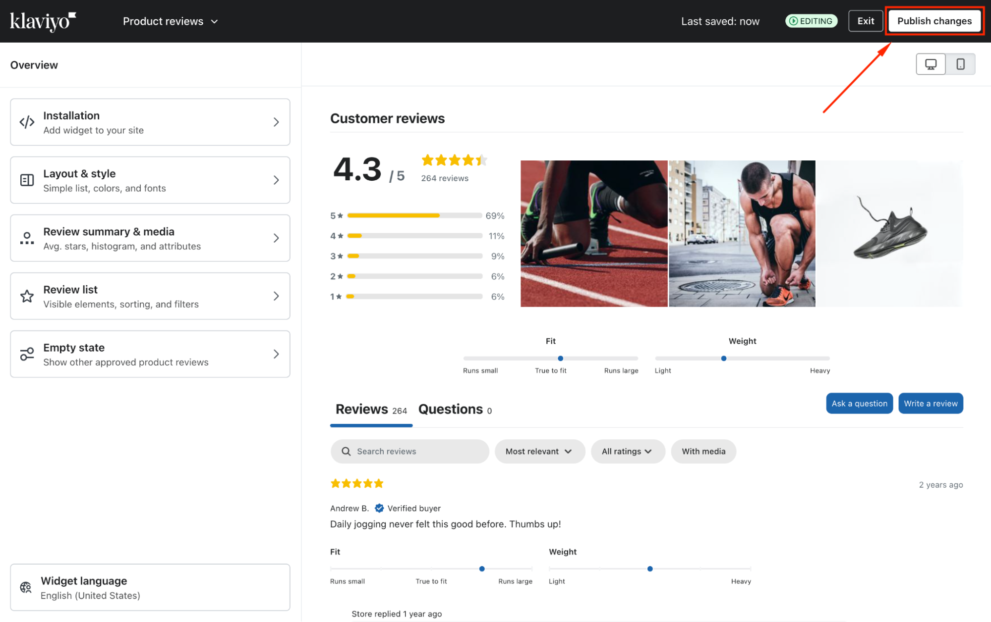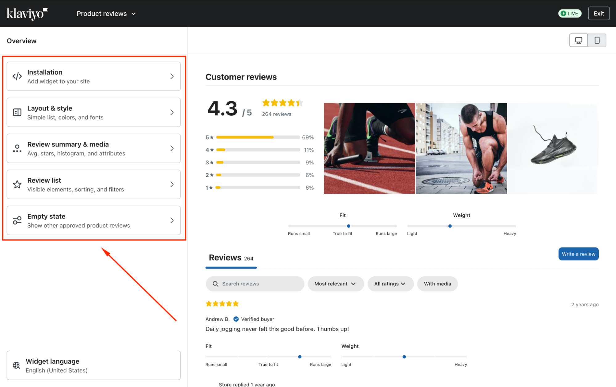 Step 2: Follow each section in the left bar to set up your Klaviyo Reviews widget.