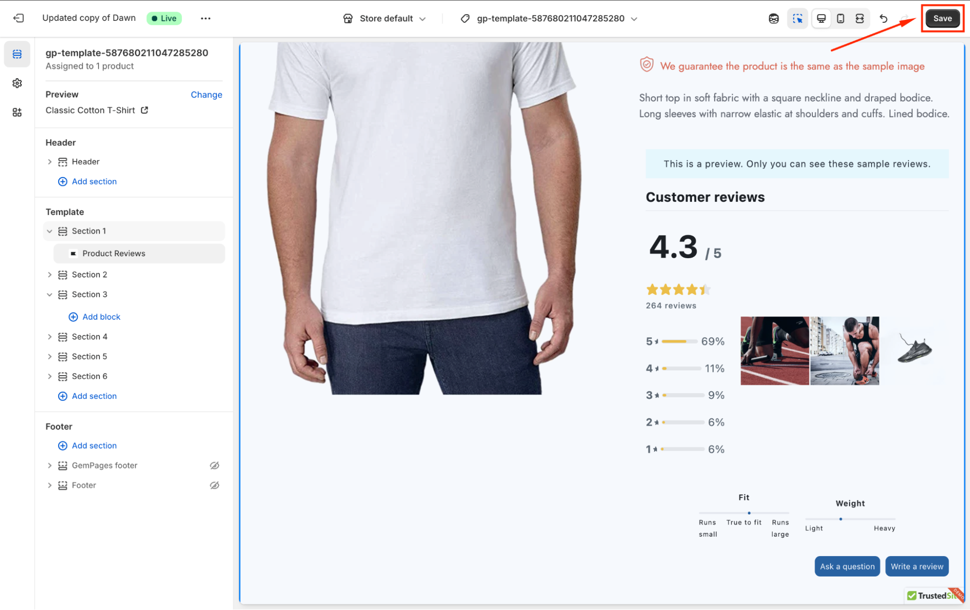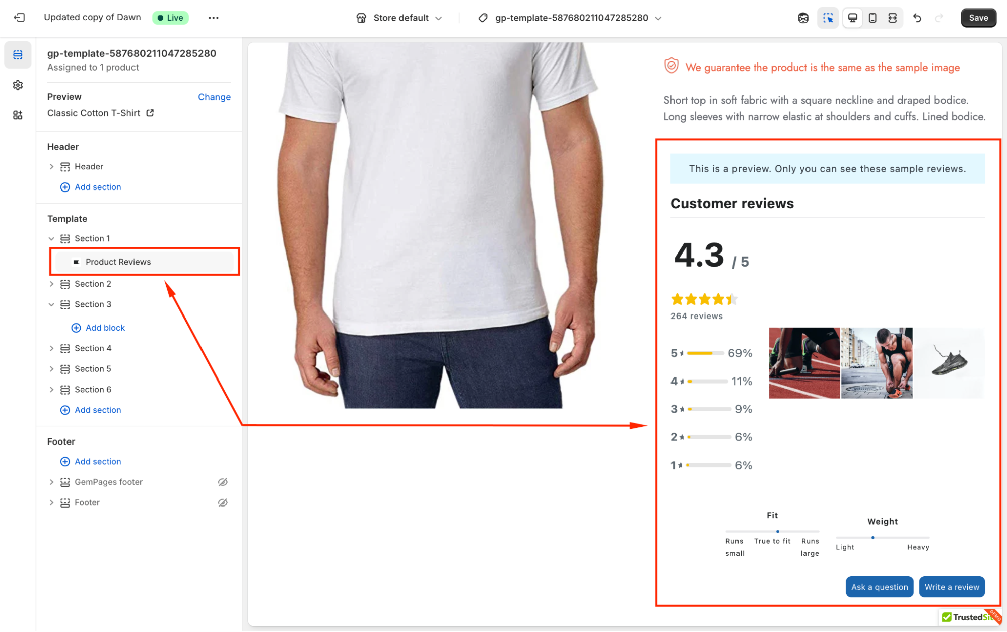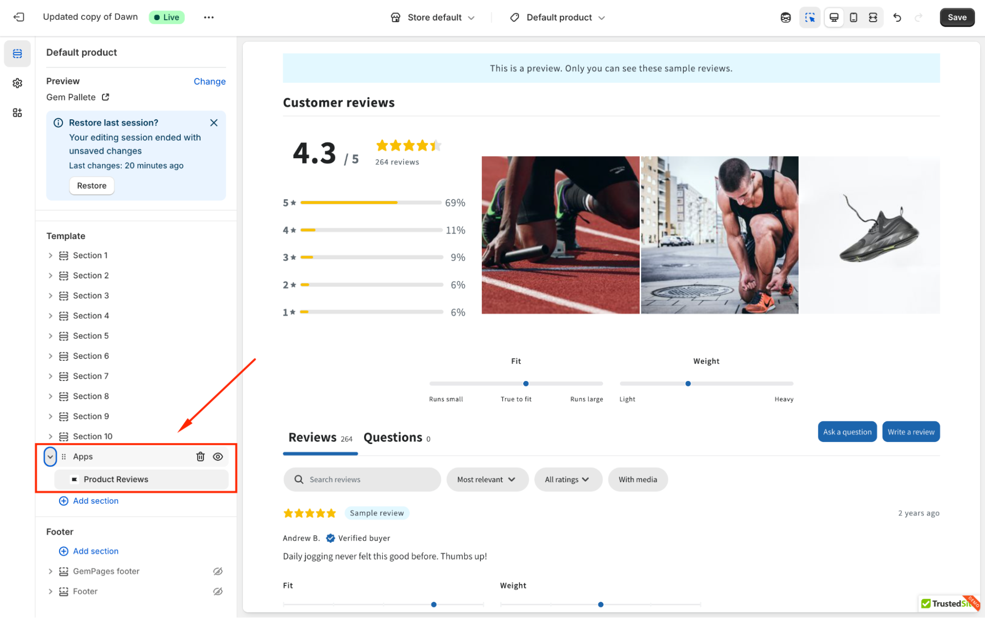 Step 4: Go to the Reviews tab and select Enable app embed on Shopify.