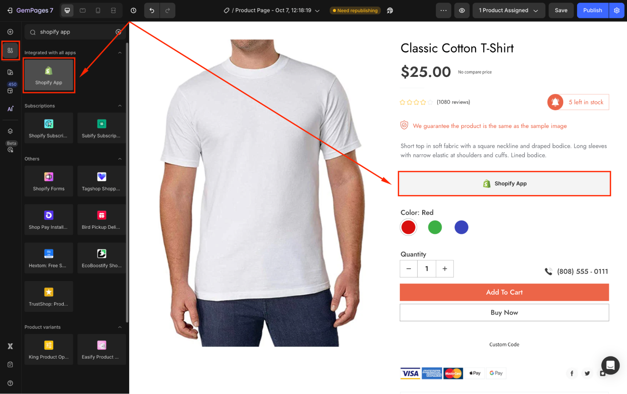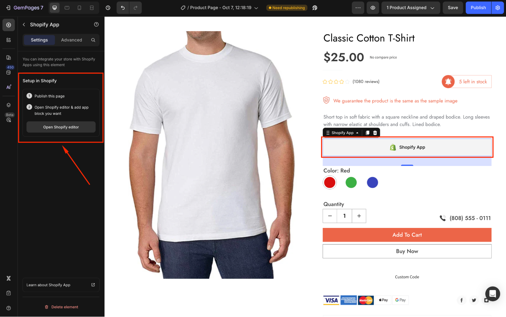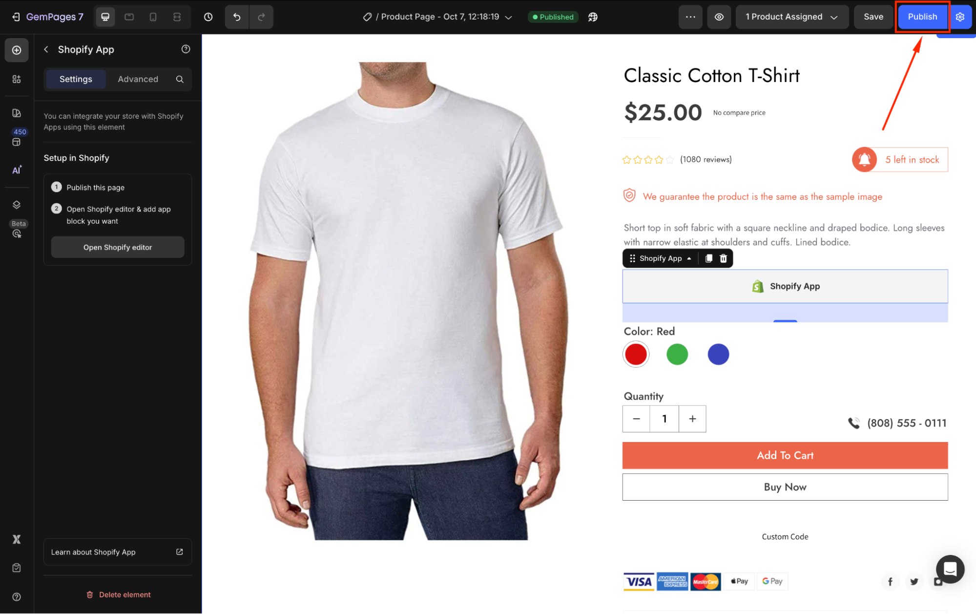 Step 3: Follow the steps displayed in the left sidebar: Publish your page, and add the app widget in the Shopify editor.