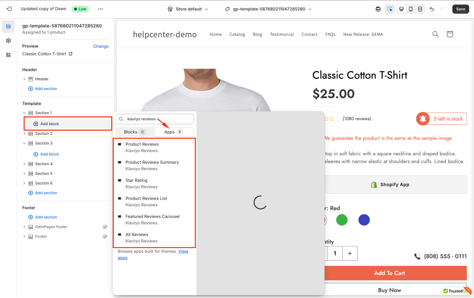 Step 5: Search for “Klaviyo Reviews” and select your preferred widget from the list.