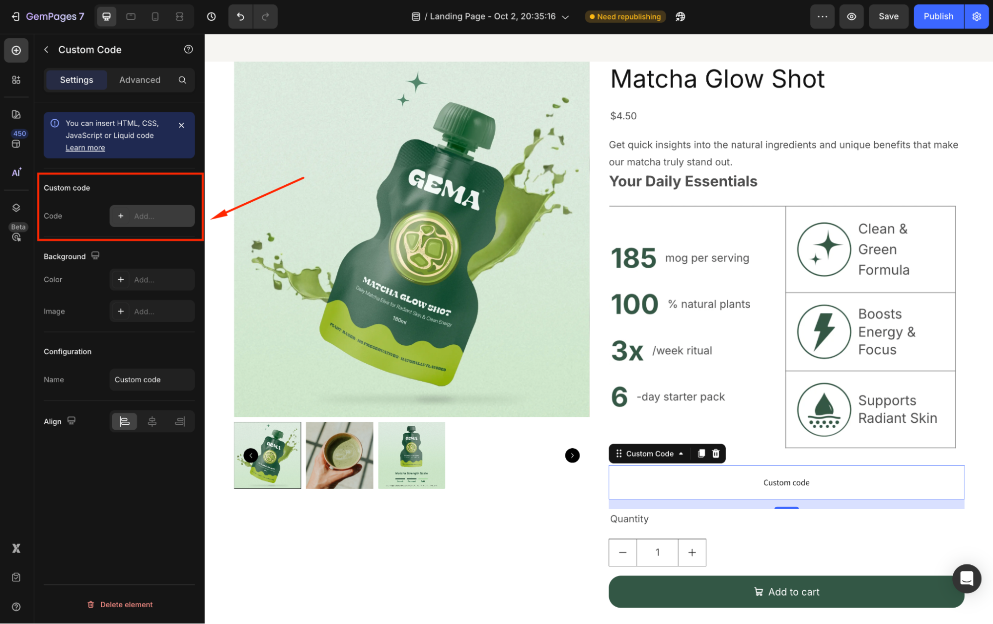 Step 1: In the editor v7, search for the Custom Code element, and nest this element in the product element.