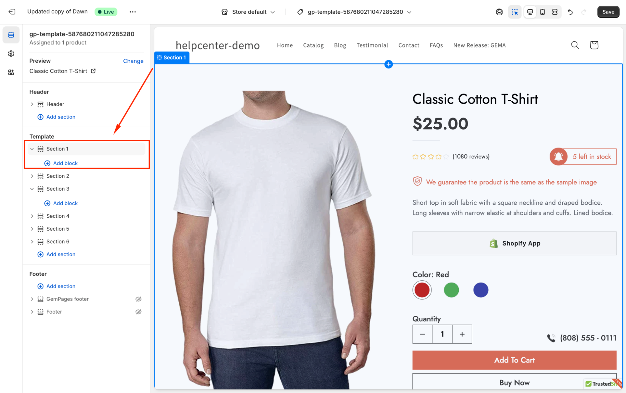 Step 4: In the Shopify editor, click on Section 1 > Add block.