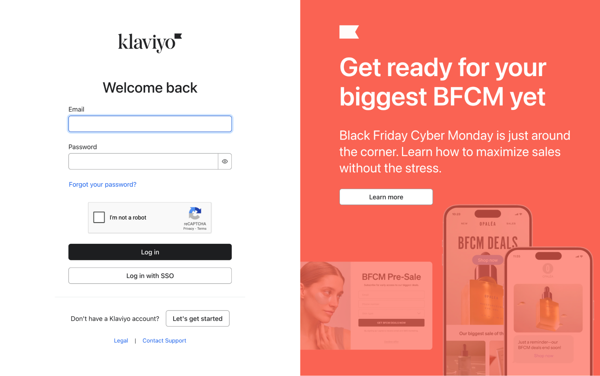 Step 3: You’ll be redirected to the login dashboard on the Klaviyo website.