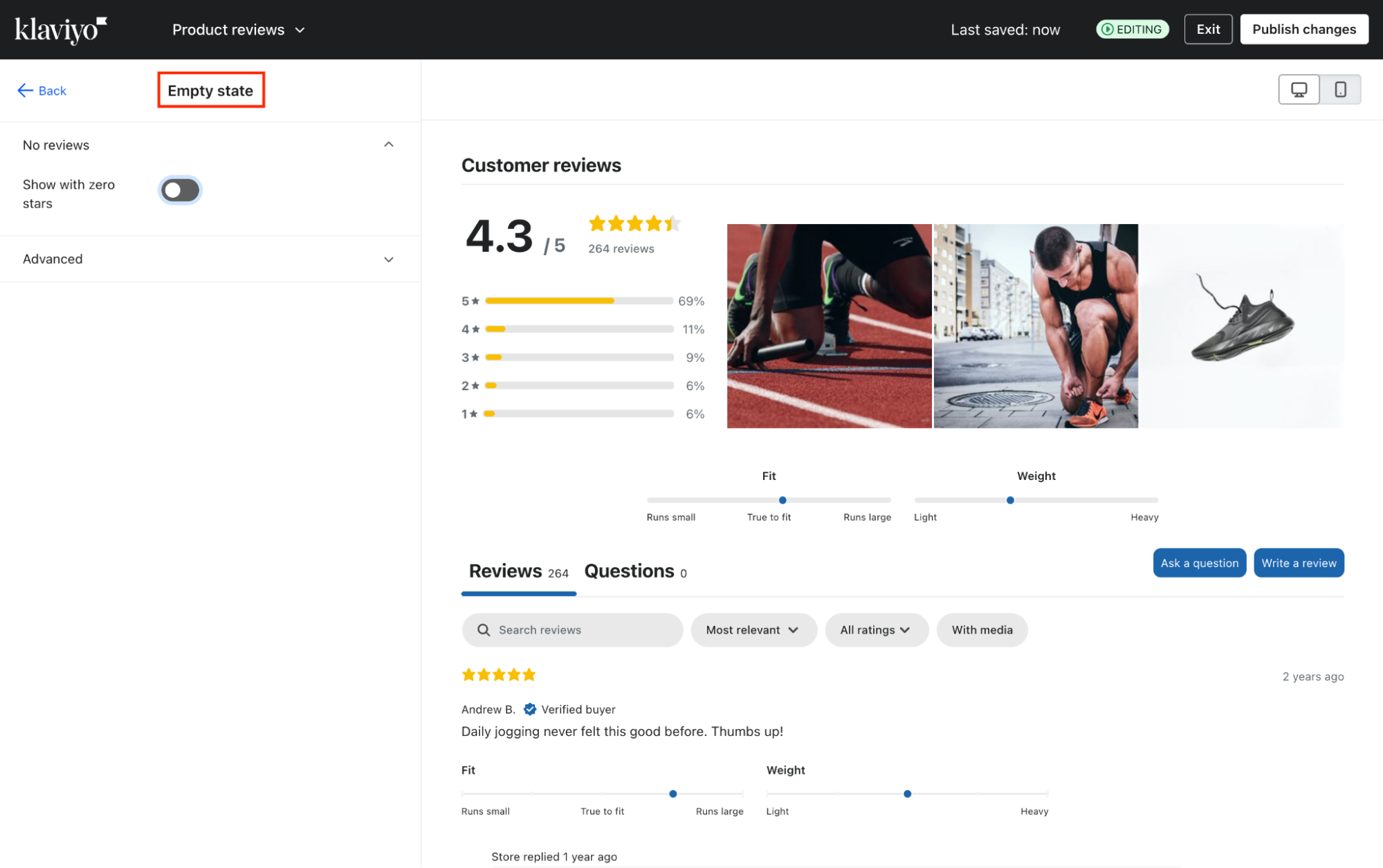 | Star rating shows even with no reviews | Empty state not configured | Go to Klaviyo Dashboard > Review Settings > Onsite Widget Star > Empty State, then update display behavior |