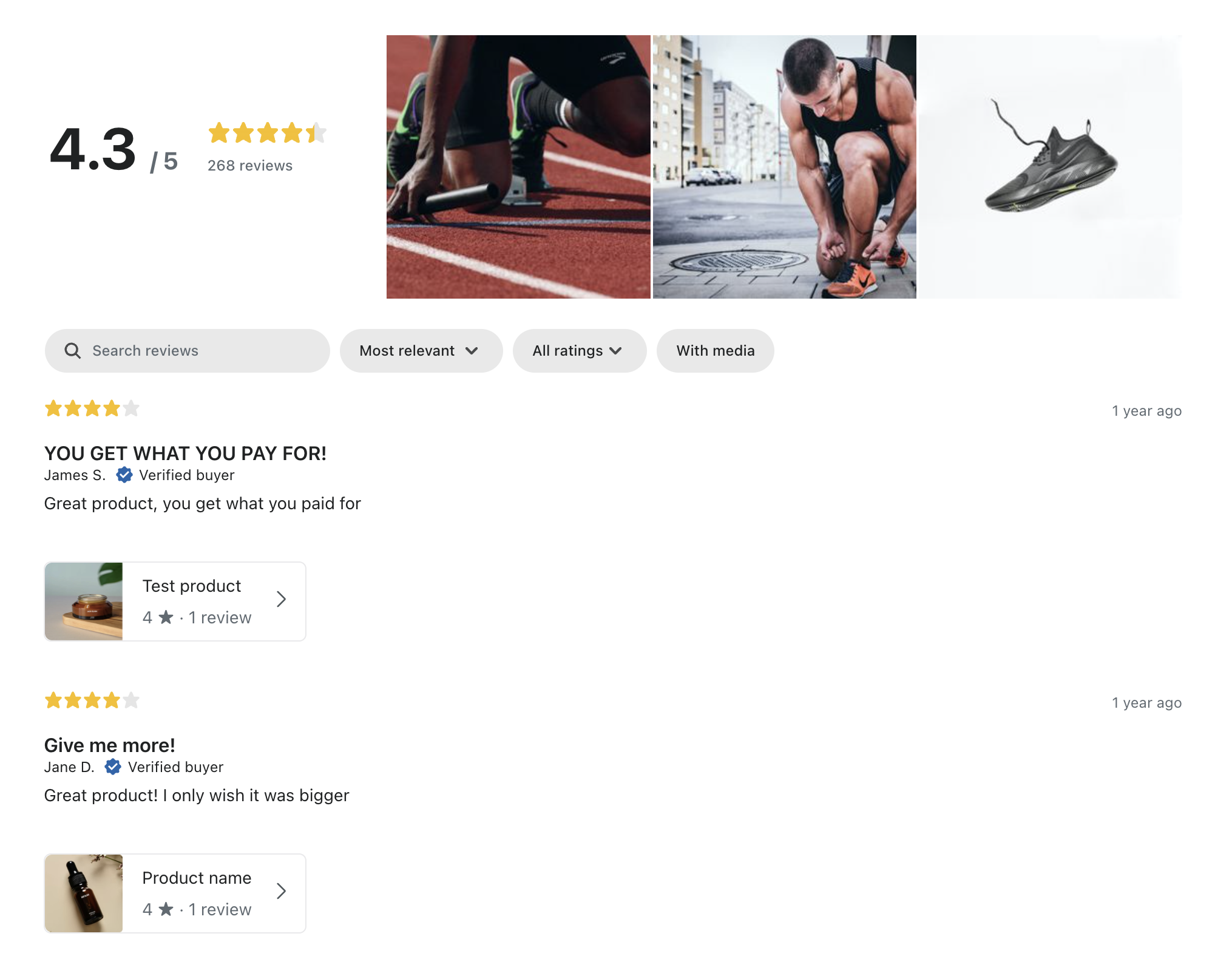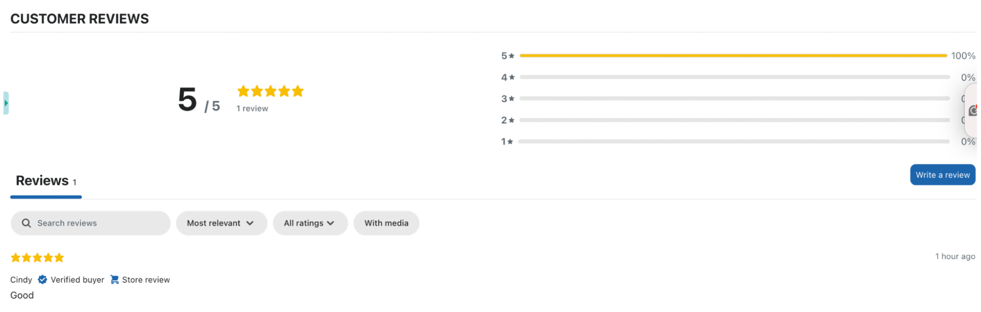 - Review section: Lists detailed customer feedback with optional images or videos.