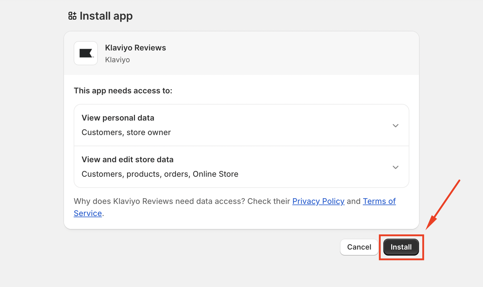 Step 1: To install the Klaviyo Reviews app, access the Shopify App Store and click Install.