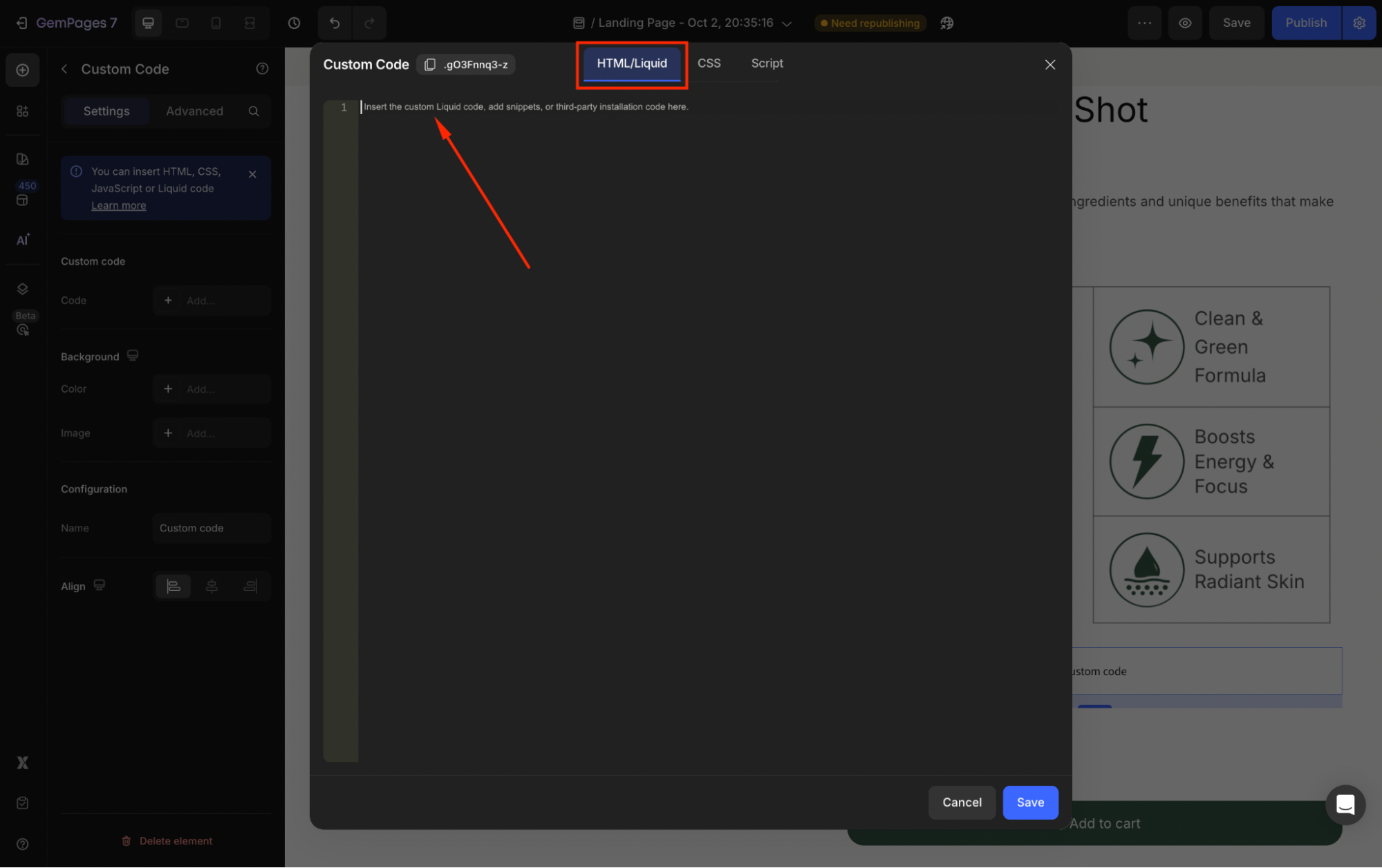 Step 3: In the code panel, paste one of the following snippets under the HTML/Liquid tab.