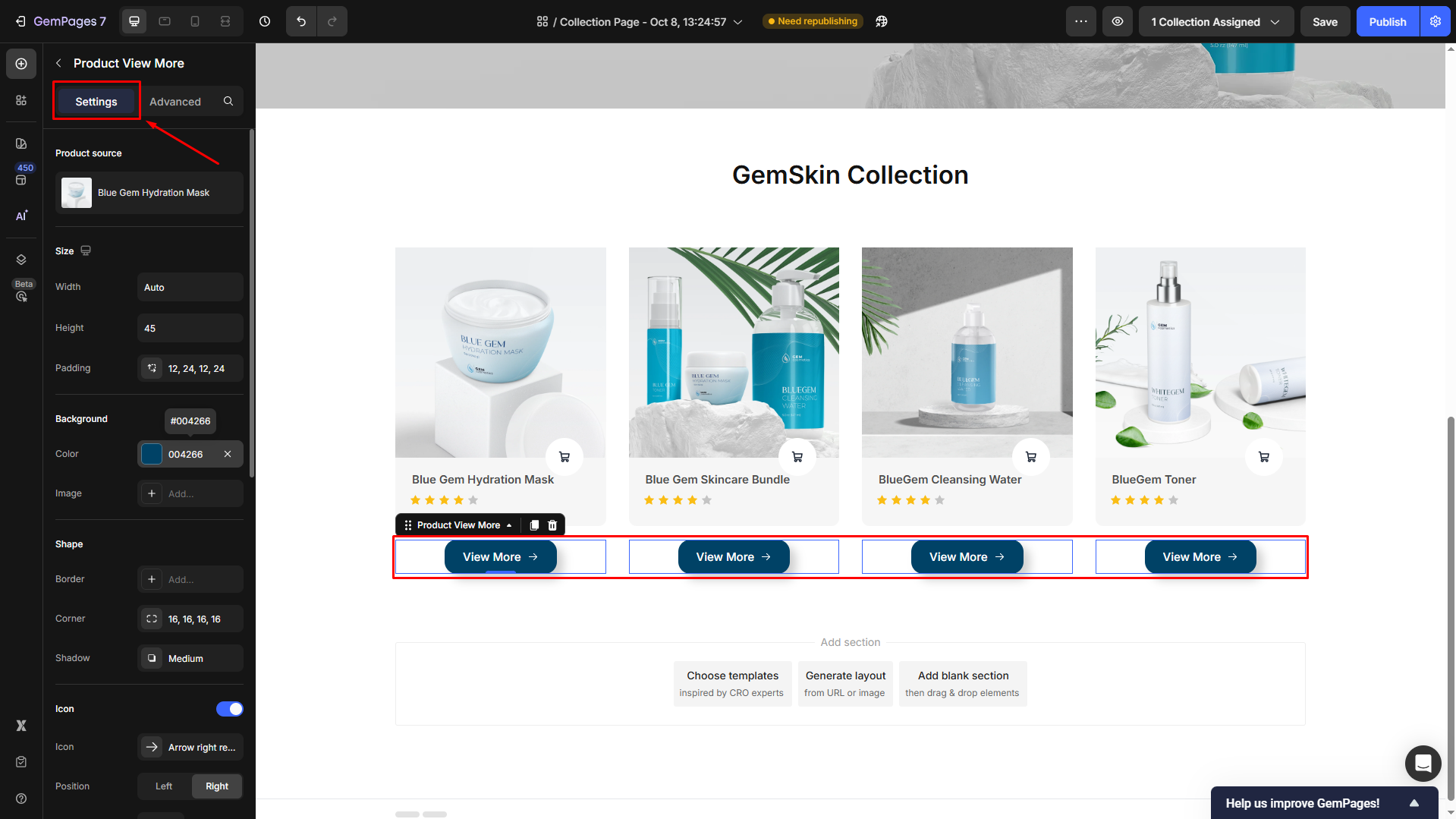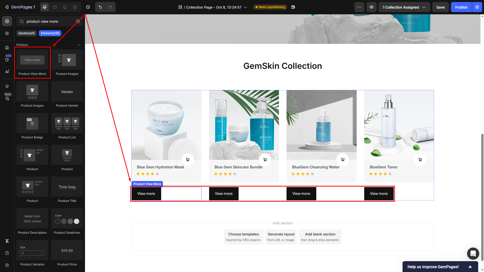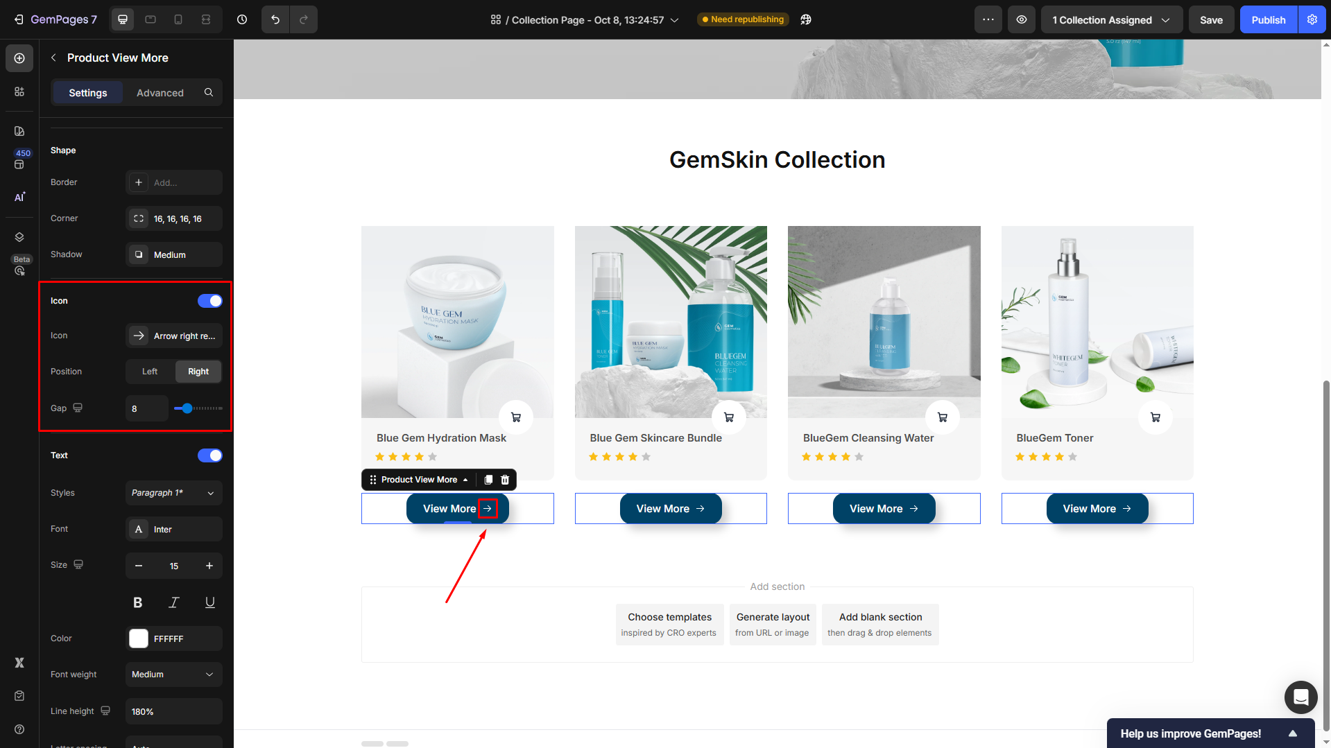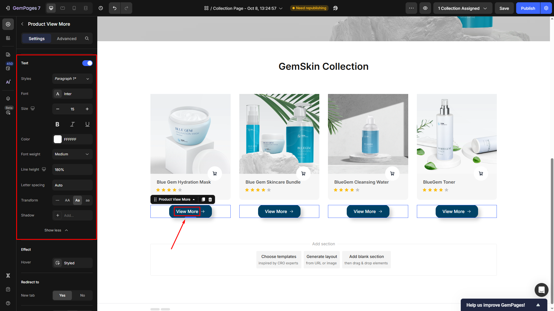 Follow these steps to link the Product View More Button to a Product Detail Page in GemPages v7:
