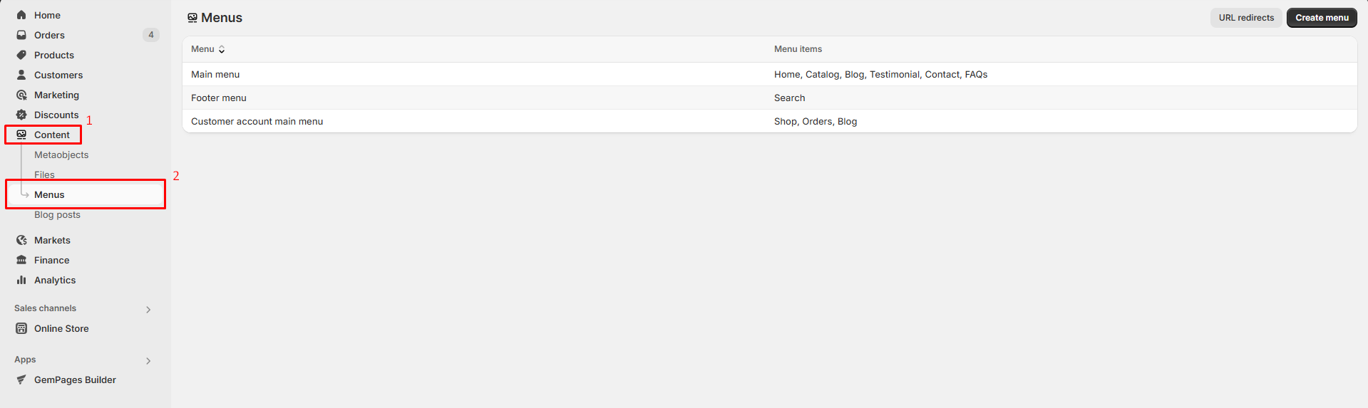 Make sure you’ve already created and your menu and menu items in Shopify Admin > Content > Menus.