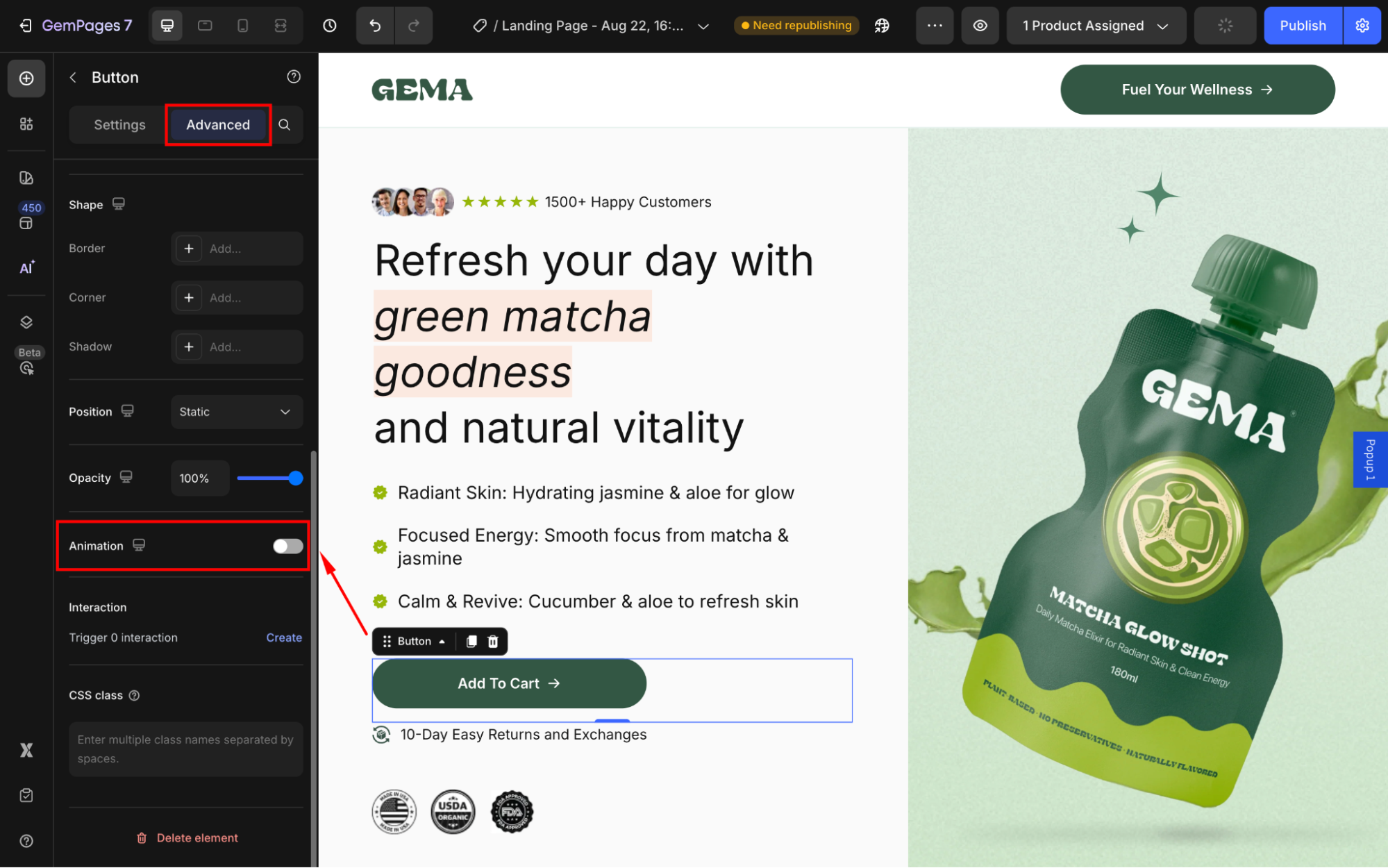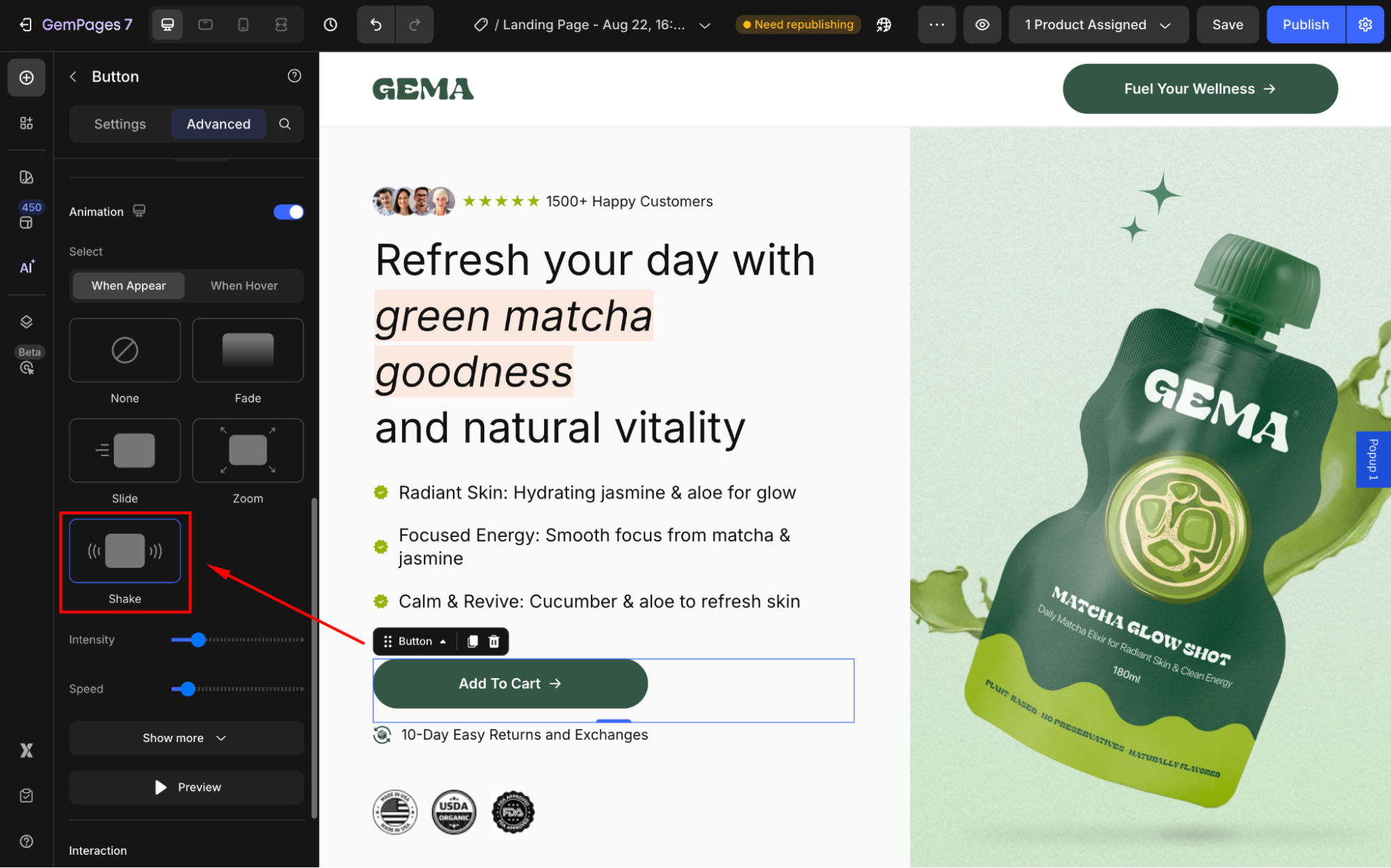 Creating a shake animation for your button in GemPages is simple and customizable. Follow these steps to implement and fine-tune the effect: