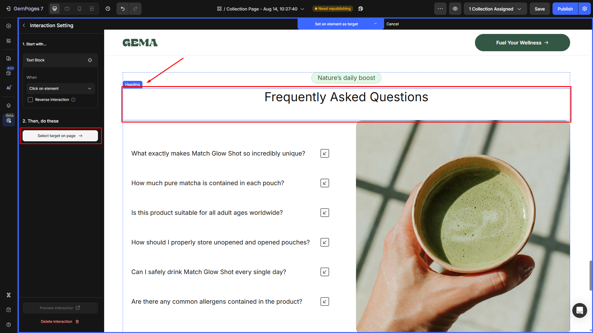 Click Select target on page. Scroll down to the FAQ section and click on the Heading element in this section.