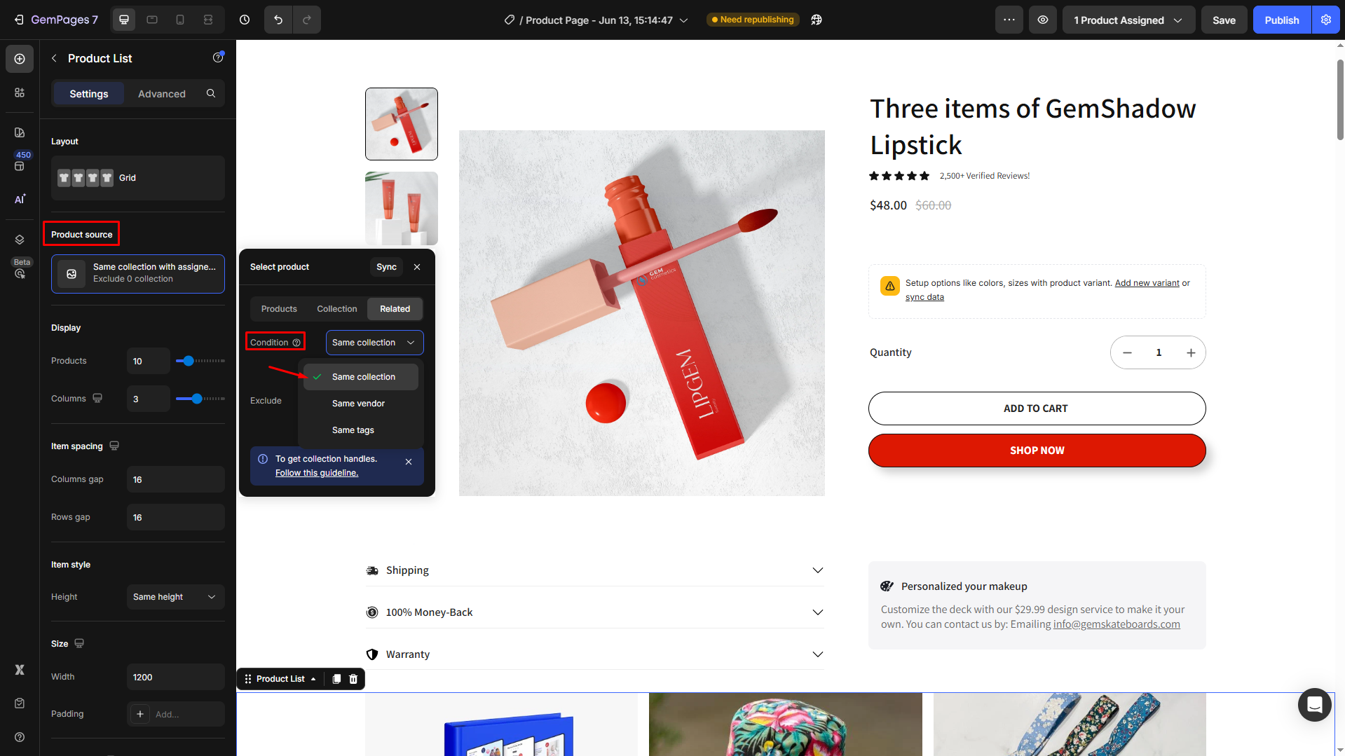 - In the Condition box: Choose the Same collection as the condition for related products from the dropdown.