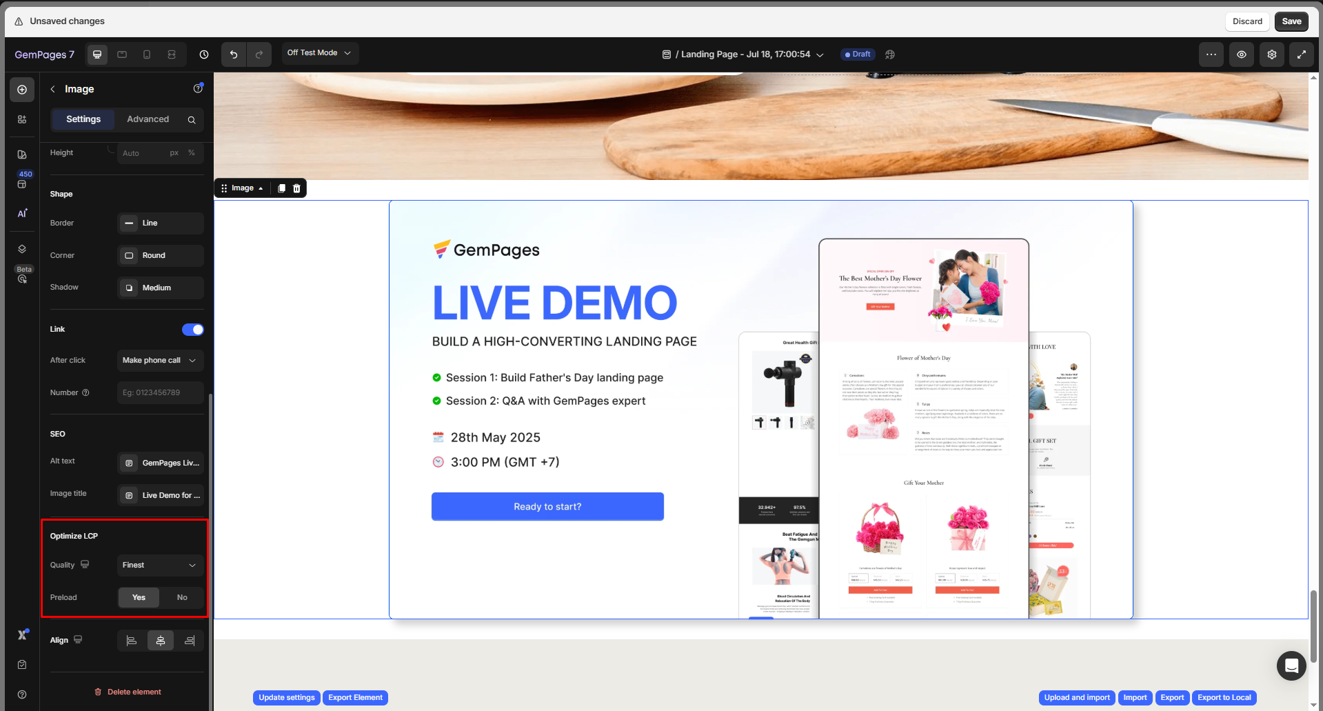 If your image looks blurry, check the Quality setting under Optimize LCP. Switching to Finest quality usually fixes the issue, but make sure the source file you uploaded is high-resolution.