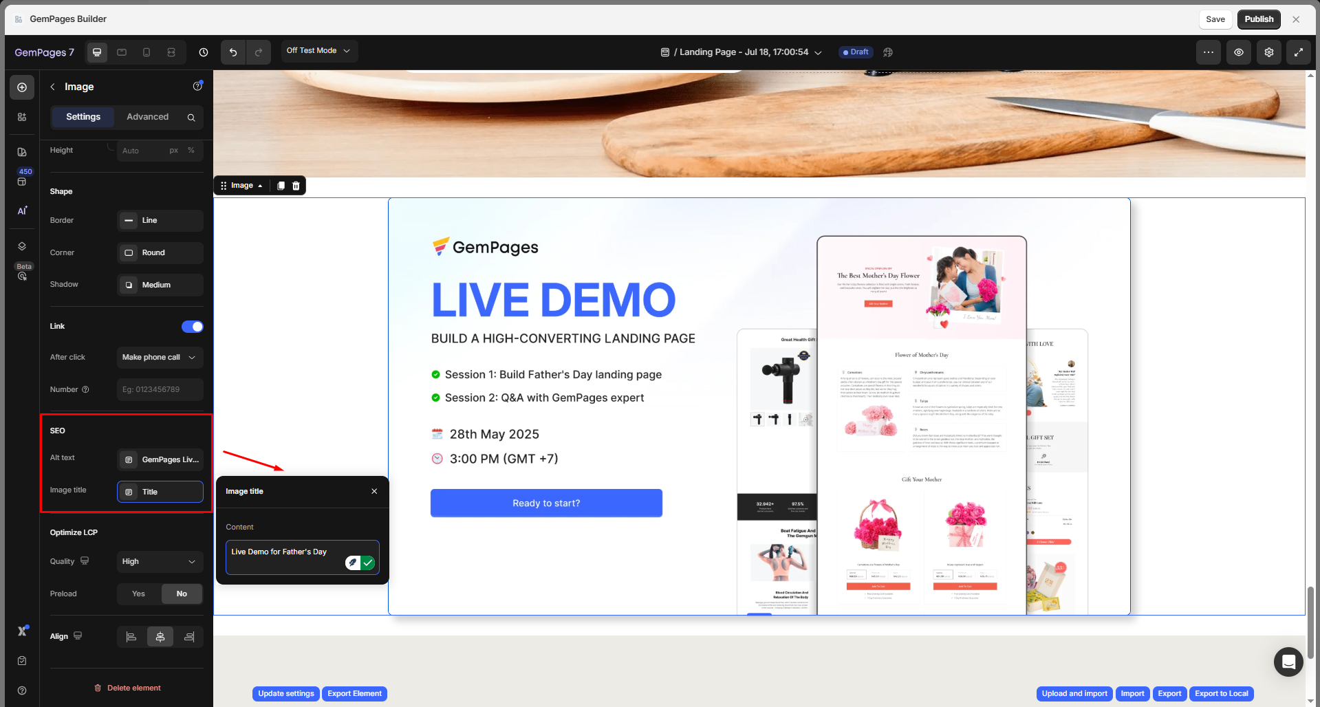 In the SEO section of the image settings, enter descriptive alt text. This improves accessibility for screen readers and helps search engines understand your image.