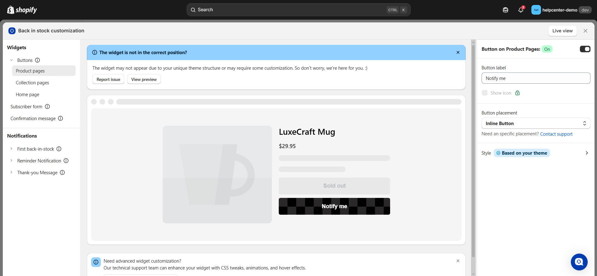 Step 5: Go to the “Back in Stock” section to personalize your widget. You can do the same for Pre-order, Wishlist, or Low-stock customization.