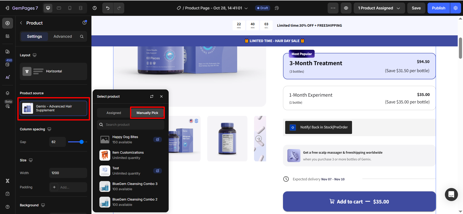 Note: To select a product, click on the product element, click “Edit” on the Product source, change to the “Manually Pick” option, and then pick the product you want.