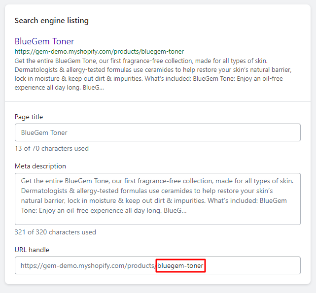 Step 1: First, you will need the product handle. Navigate to Shopify Admin > Products > Search engine listing. Under the URL handle section, you will find your product handle listed after “/products/“.