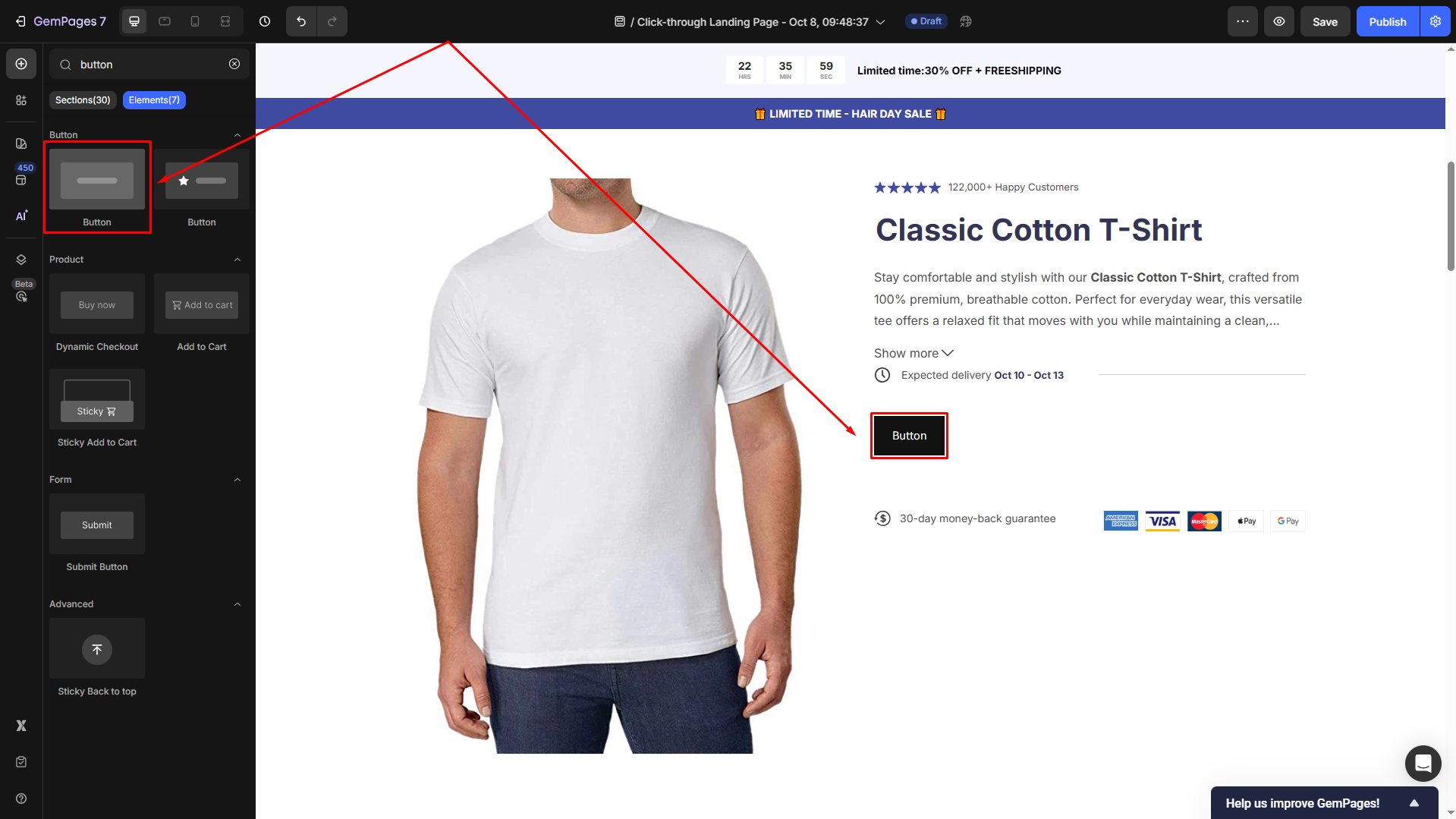 To begin, access the GemPages Dashboard and select the template you wish to edit. Locate the button element conveniently situated on the left sidebar of the editor.