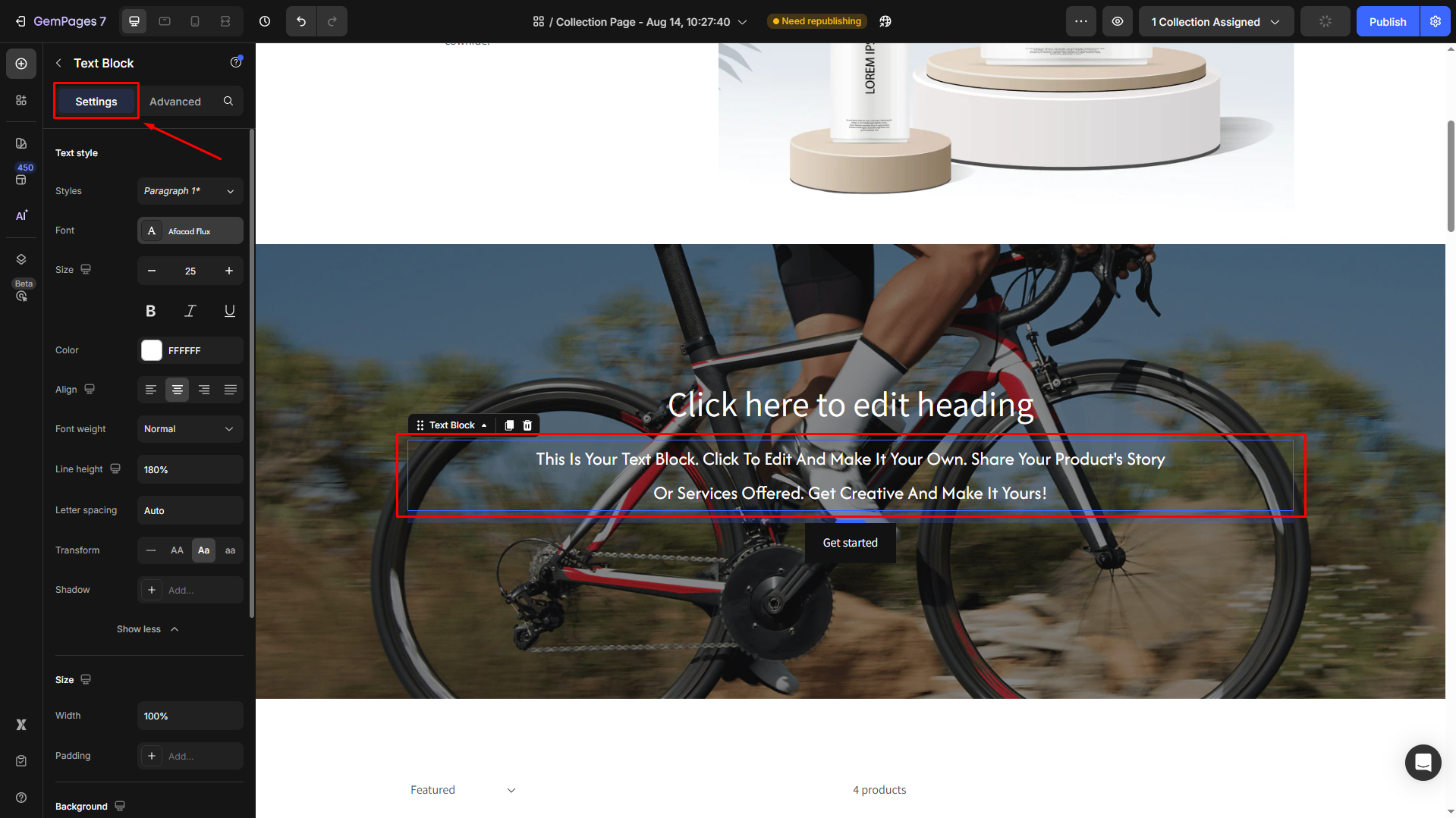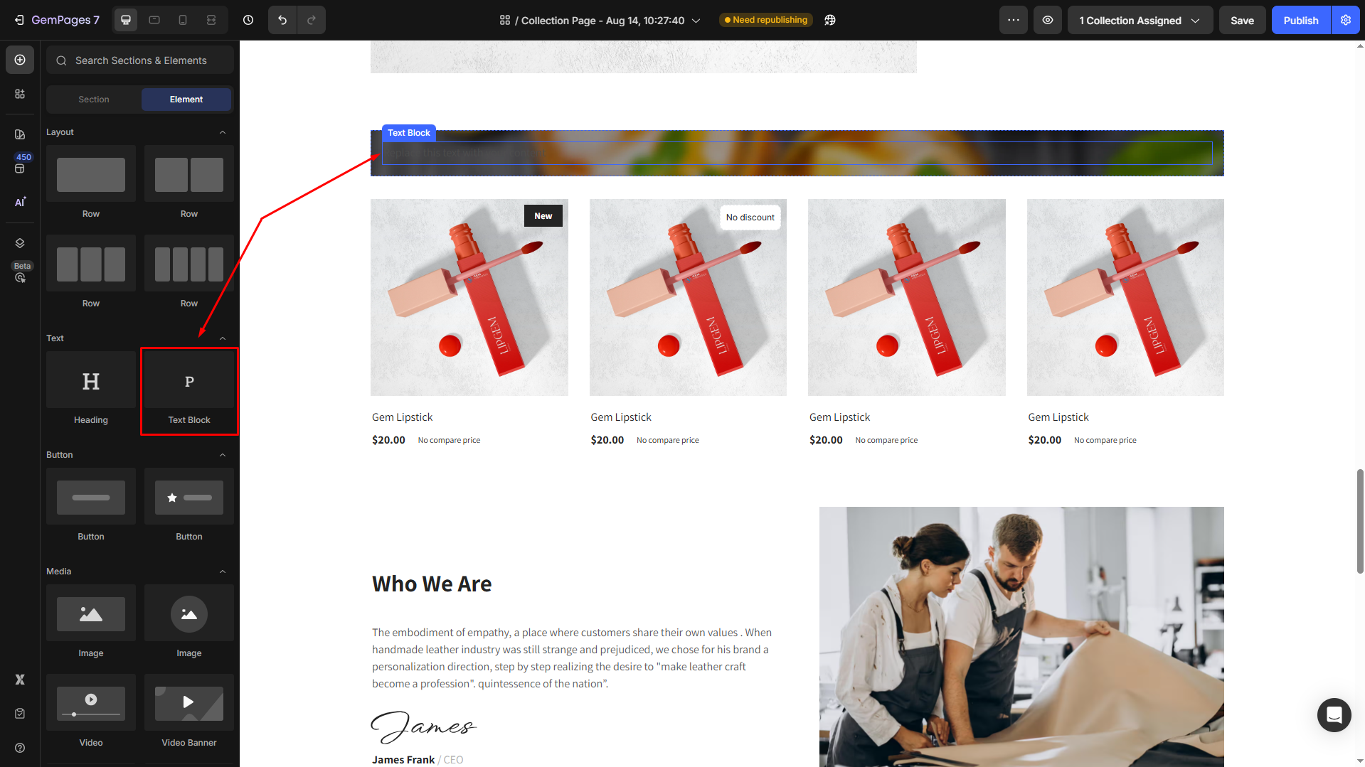 Click on the Text Block element to reveal its configuration. Then, customize the text’s font, size, and color right from the settings panel to ensure it stands out against the image.
