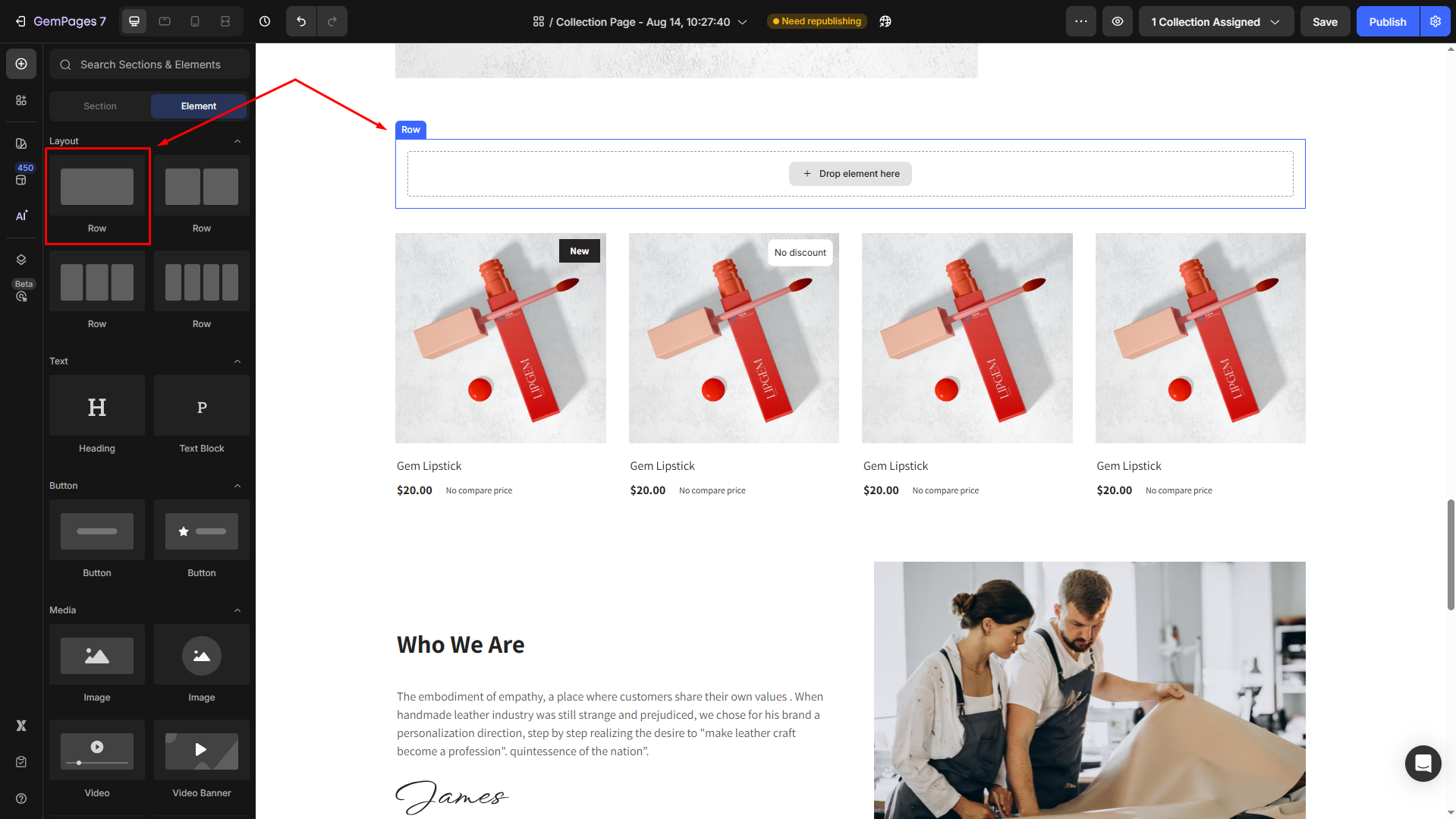 Step 1: In the editor, drag and drop a Row element from the left sidebar to your page.