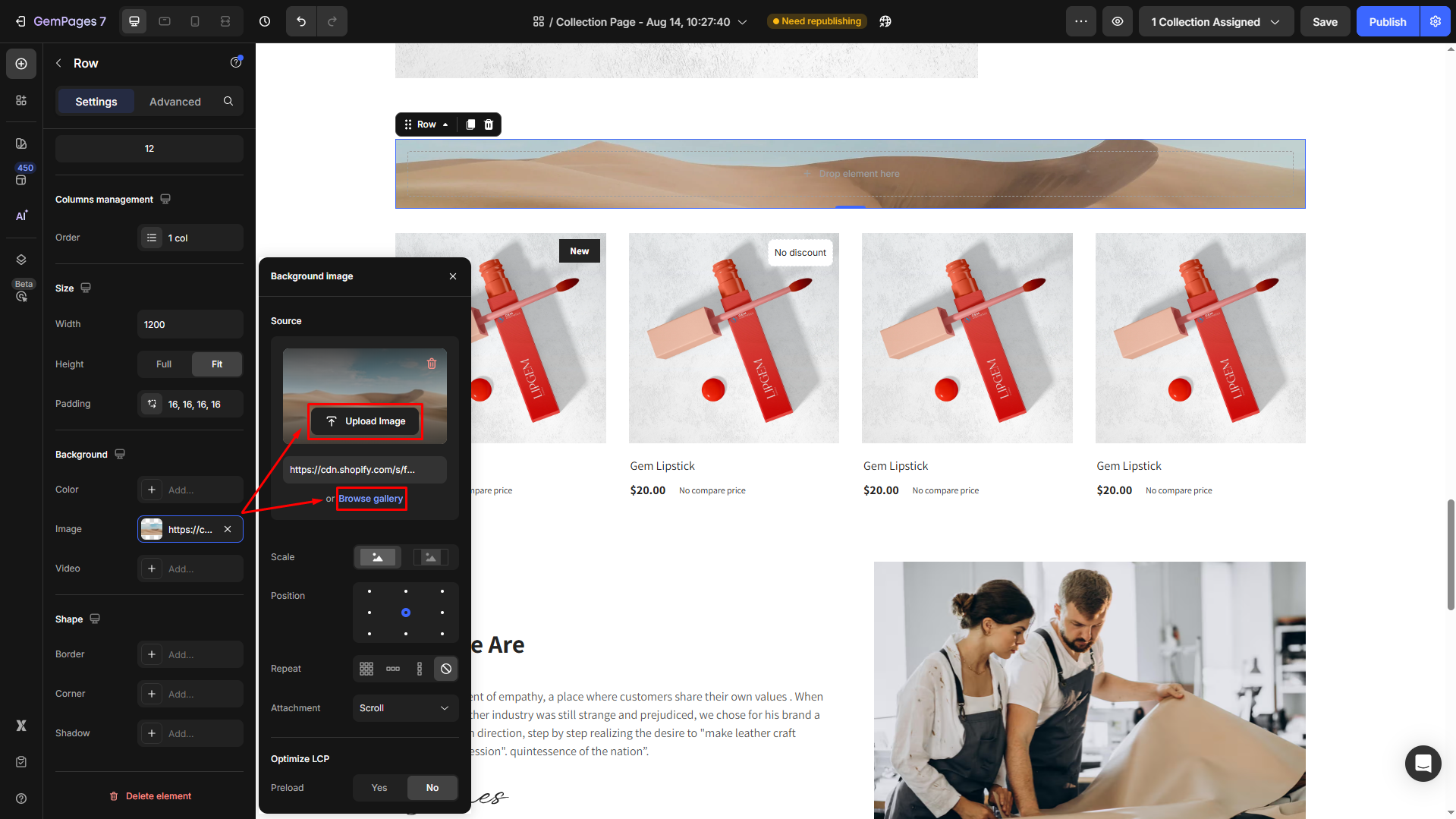 Step 3: Set an image as the background for the entire Row. You can choose from the Shopify Files (Browse library) or upload a new one.