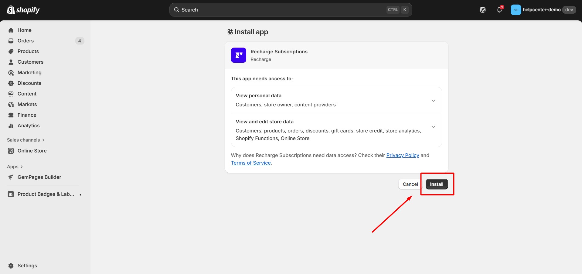 Step 2: Shopify will redirect you to a confirmation page. Click Install to grant access to the app.