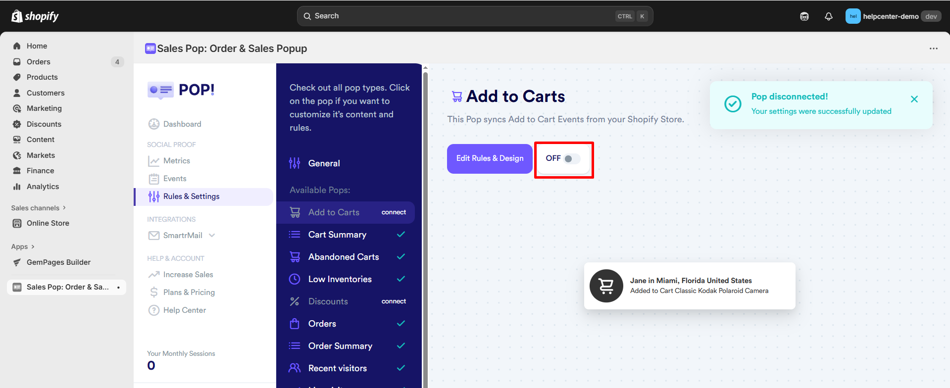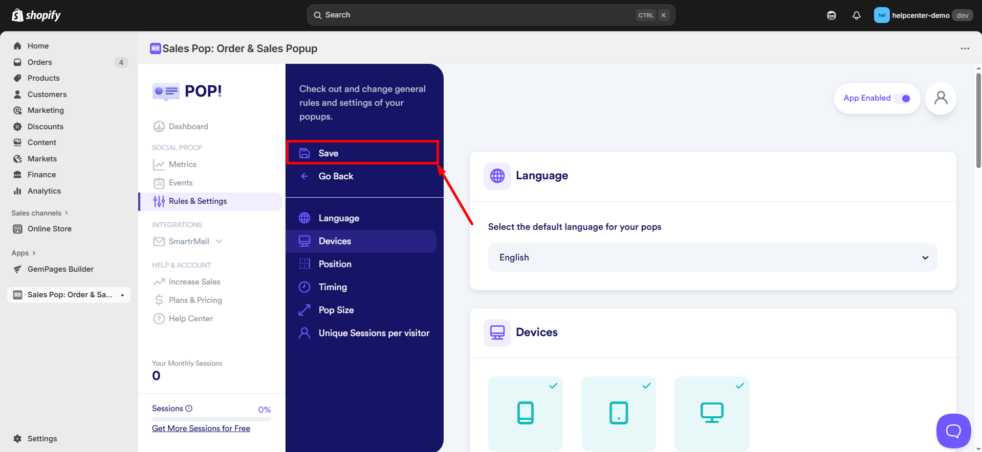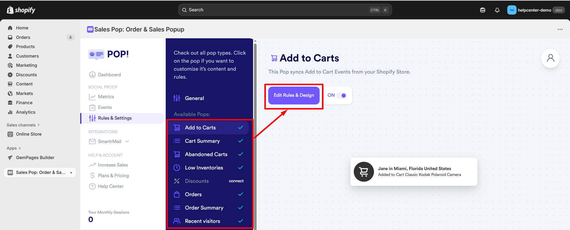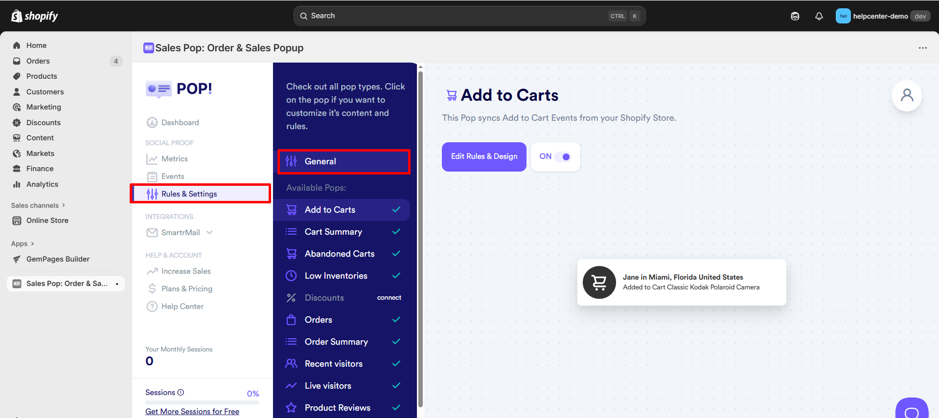 Step 4: Open the SalesPop: FOMO + Sales Popup app. Get started by choosing “Rules & Settings” and clicking “General” to make edits for all the pops.