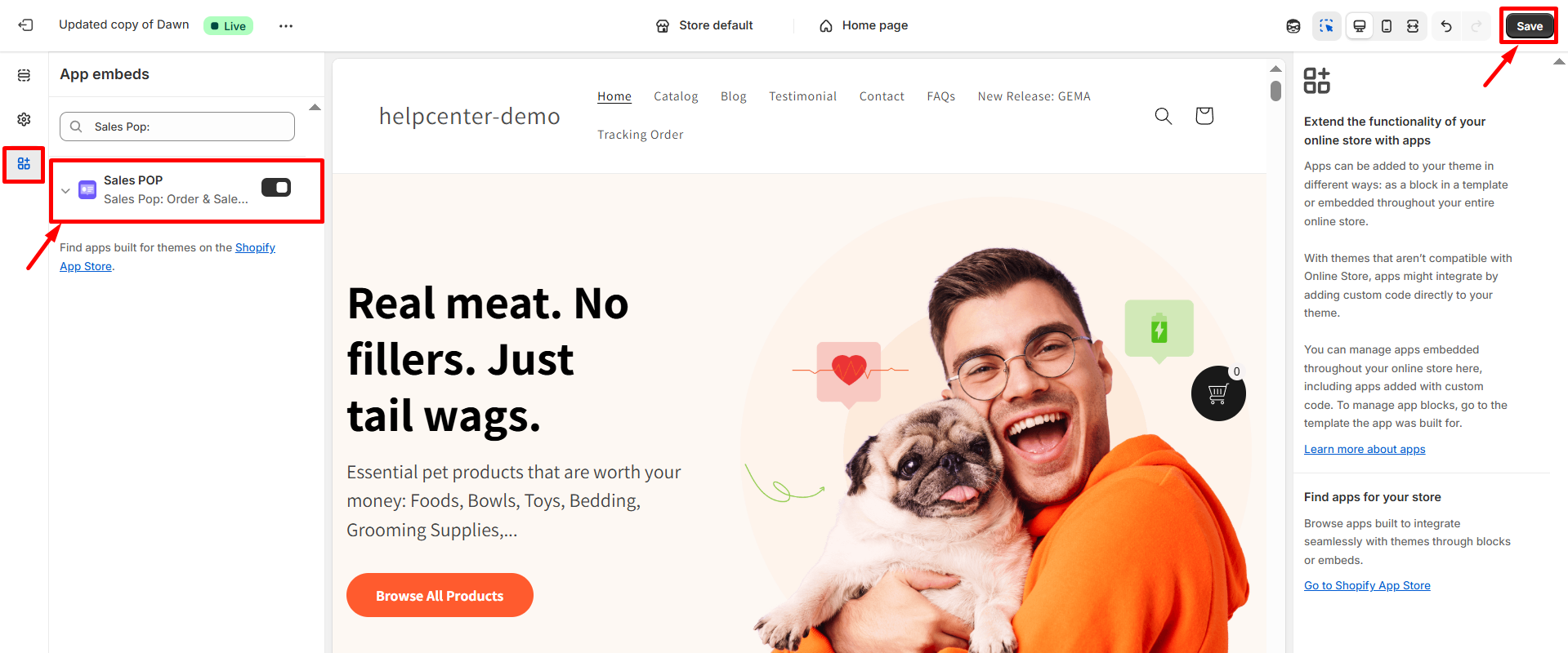 - In the left panel, click on the App embeds icon, toggle the button ON, then click “Save” to enable the app in your theme’s editor.
