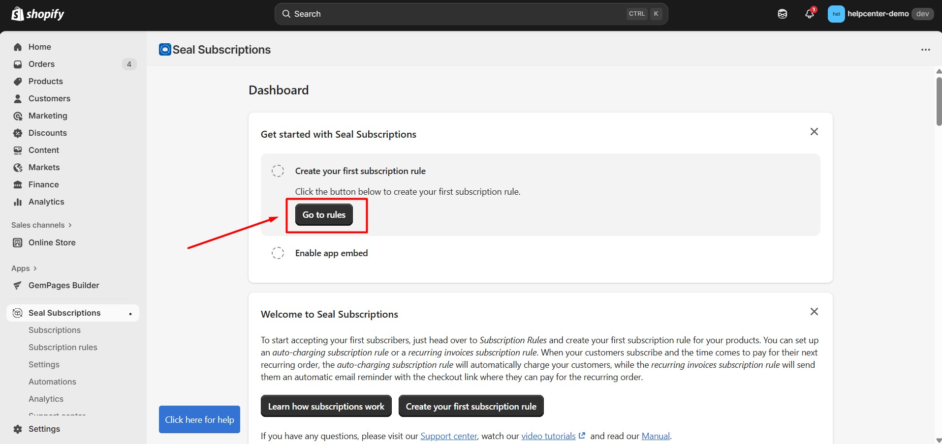 Step 4: Create your first subscription rule by clicking Go to Rules inside the Seal Subscriptions app.