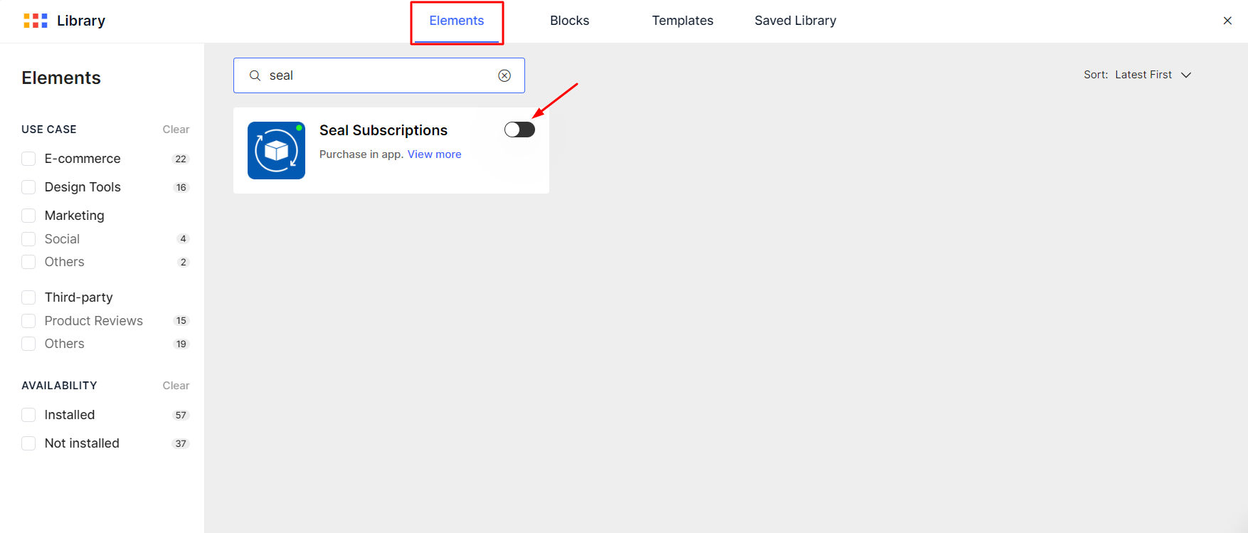 Step 3: Go to the Elements tab and search for “Seal Subscriptions”. Toggle on the corresponding switch.