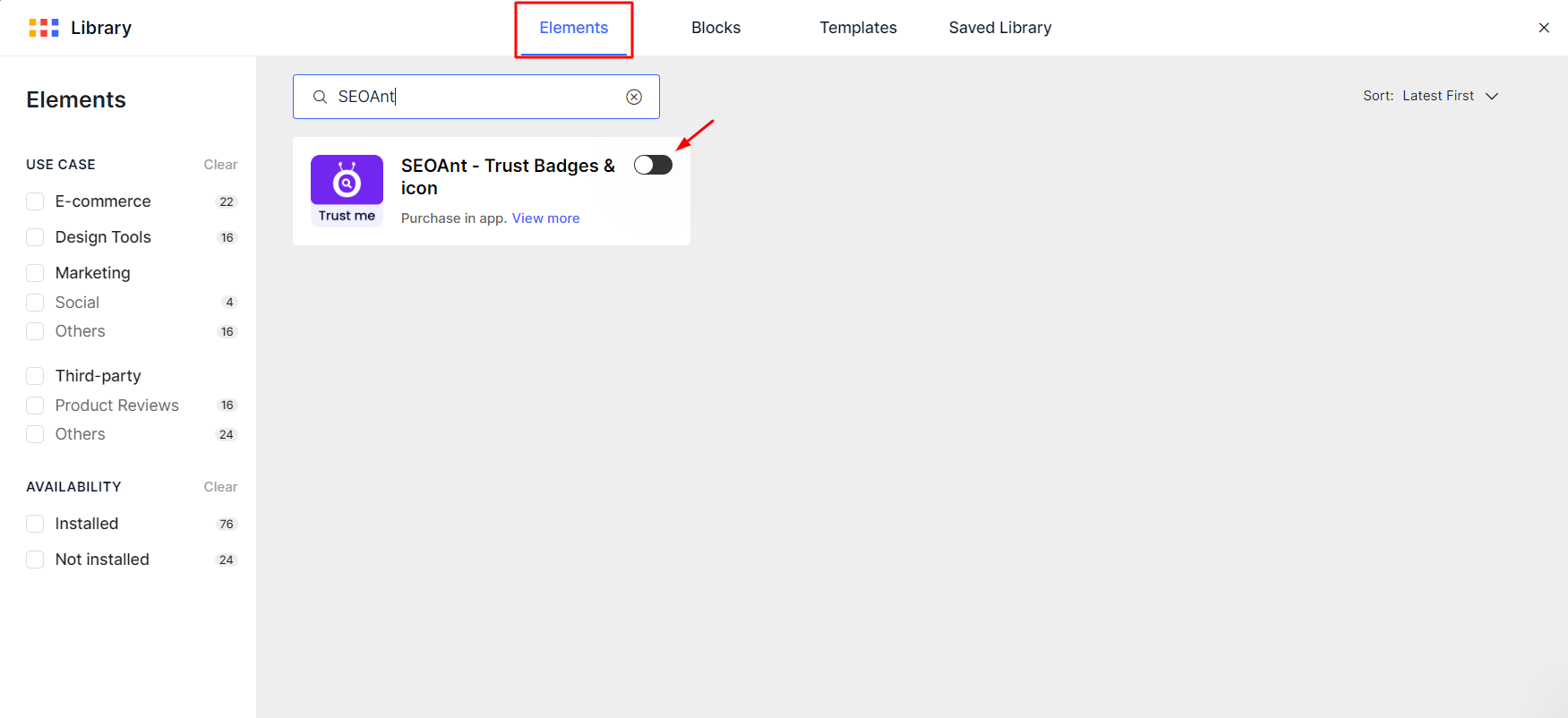 Go to the Elements tab and search for “SEOAnt”. Toggle on the corresponding switch.