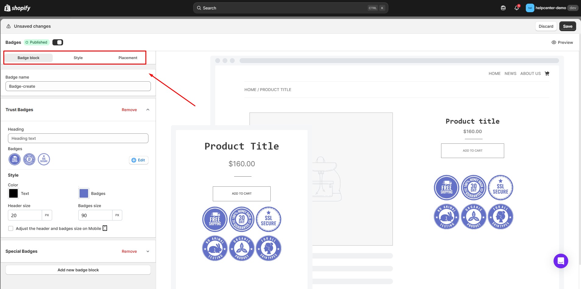 You can preview badges on both desktop and mobile, customize their style, and adjust their placement to match your store’s design.