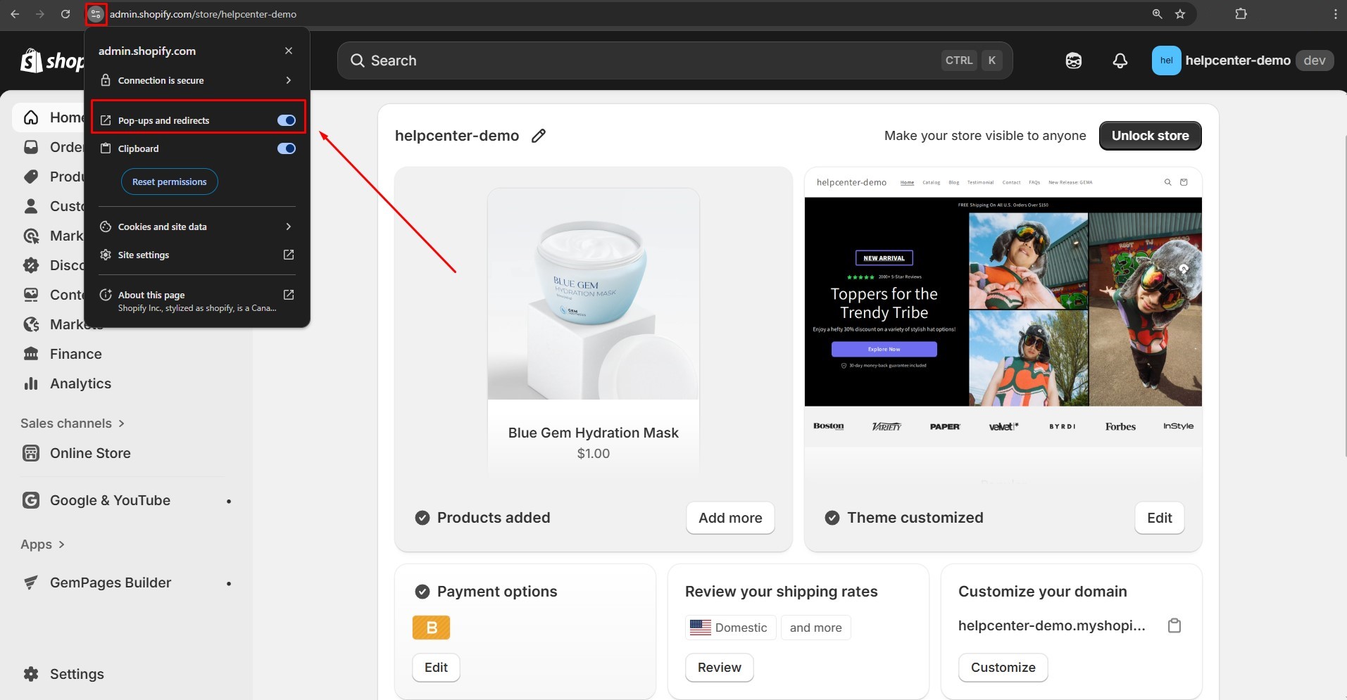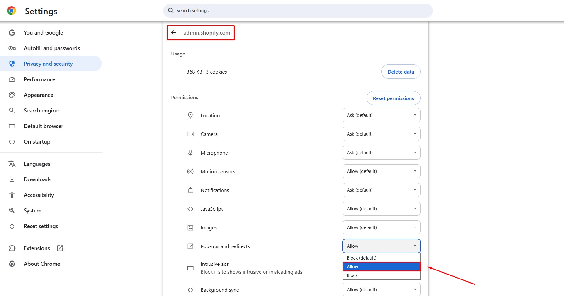 To fix this, you’ll need to allow pop-ups and redirects for your Shopify Admin site (admin.shopify.com).