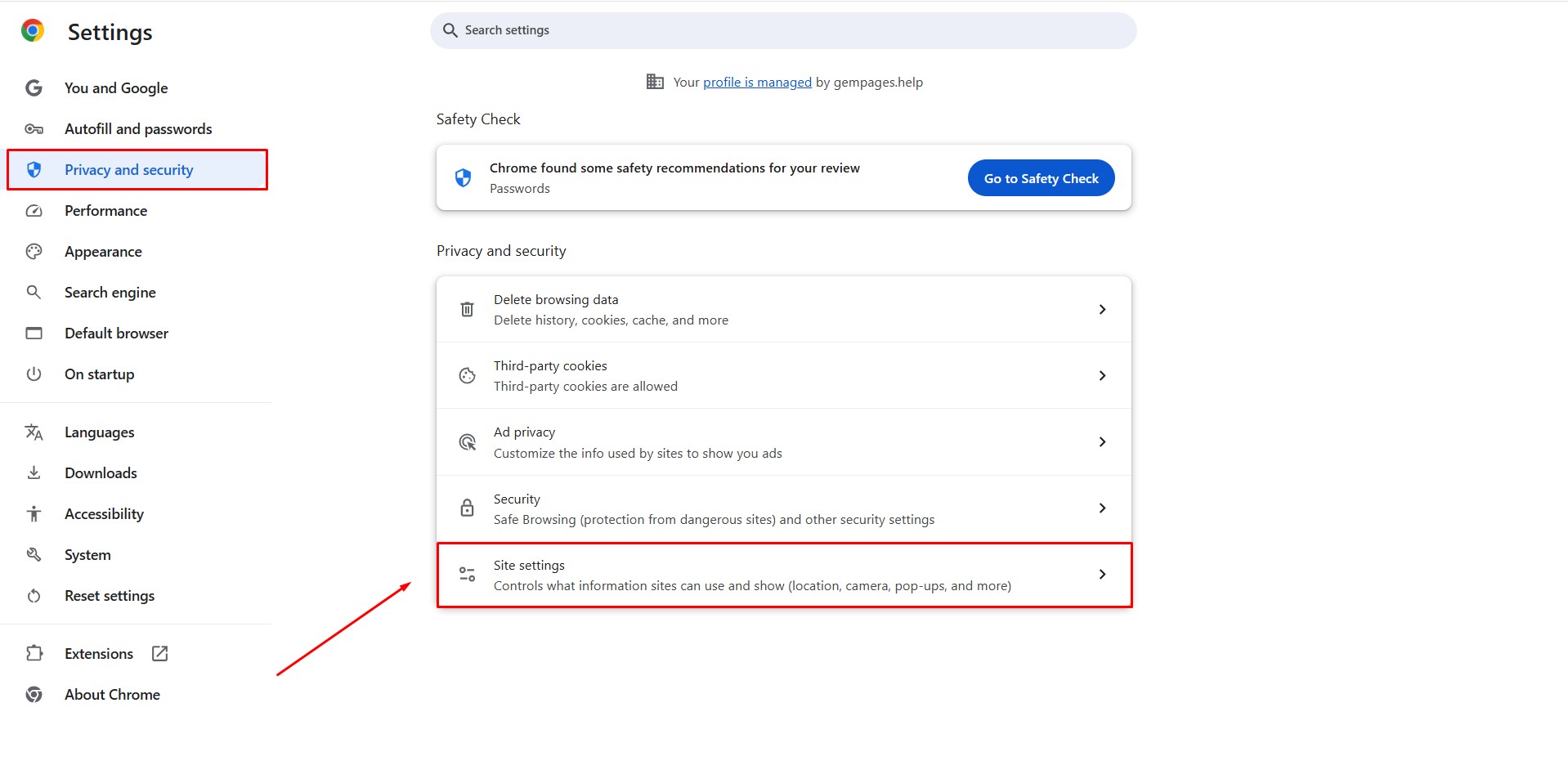 Step 1: Open your browser Settings. Go to Privacy and security → Site settings.