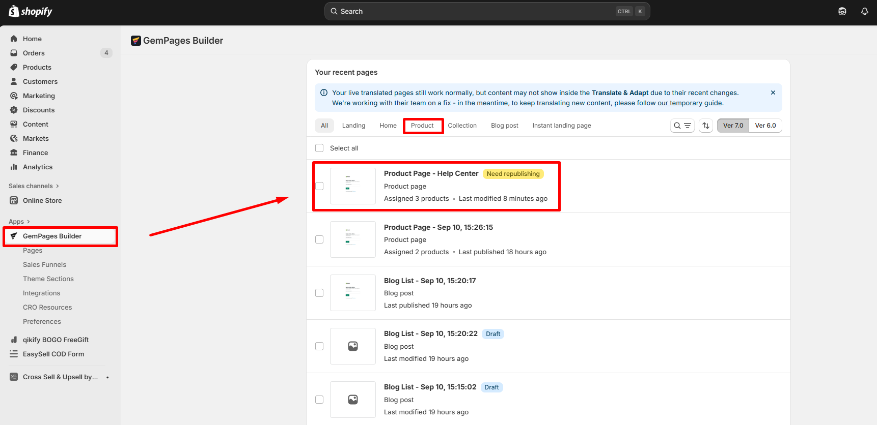 Step 1: From your Shopify admin, locate the GemPages Builder in the Apps section. Go to Pages > Product to access all product pages built with GemPages.
