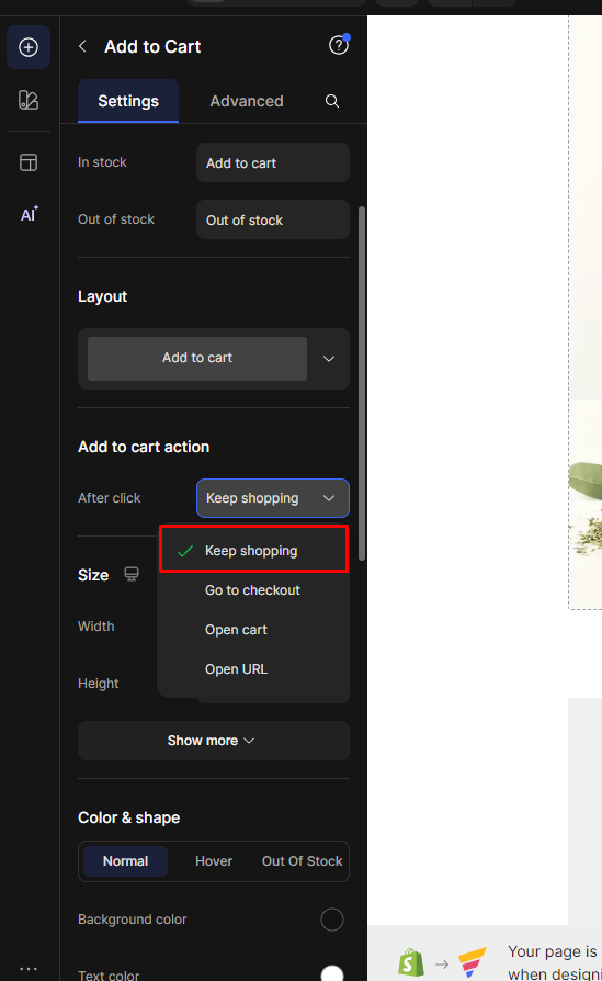 Step 3: Under Add to cart button section, select “Keep Shopping” as an action after click.