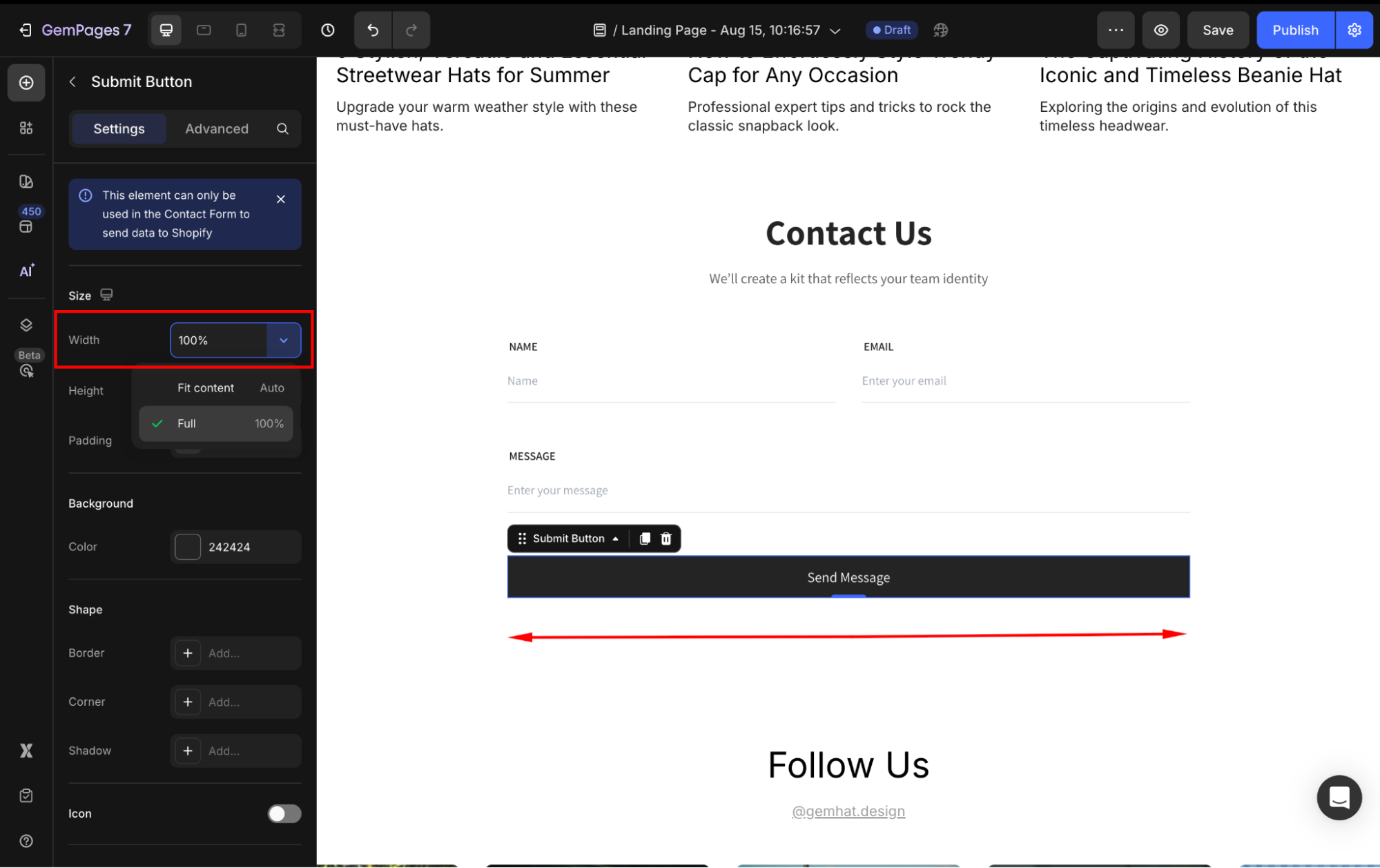 - Custom width: If you prefer other values, enter a specific number in the box (in %) to adjust the button’s width your way.